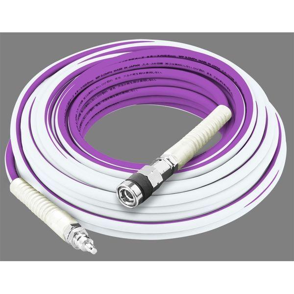 フジマックメーカーお問い合わせ:06-6568-3391【商品説明】●特徴●限定色!バイオレット&ホワイト●オス、メスカプラは回転式ベアリング入りより戻し機構、ホースがねじれず使いやすい。●ワンタッチ一発 接続が片手でも簡単に取付け。●ワンタッチロック ソケットのスリーブを回すとロックされ、不意の離脱を防止できます。●セーフティガード付ガイド ホースの折れやパンクを防止・保護。●仕様、規格●内径:6.0mm 全長:20m最高使用圧力:3.0MPa●高圧専用
