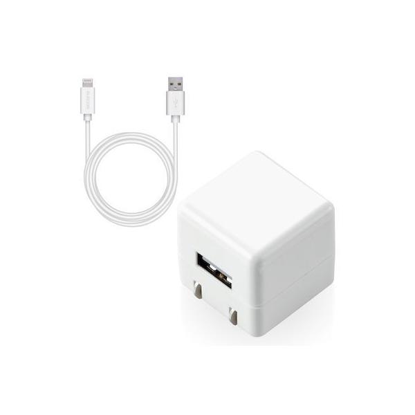 エレコムメーカーお問い合わせ:0120-898-794【商品説明】●家庭用コンセントからLightningコネクタ搭載のiPhoneやiPodを充電できるLightningケーブルを付属したAC充電器です。●携帯に便利なコンパクト設計のかわいいキューブ型デザインを採用しています。●スマートフォンやタブレットに付属もしくは対応する充電用USBケーブルを使用して充電可能です。●付属のLightningケーブルは、充電だけでなくパソコンとのデータ通信にも使用可能です。●壁面のコンセントに接続してもゆとりのあるケーブル長1.5mを採用しています。●コンパクトサイズでありながら、未使用時は電源プラグを折りたたんで充電器本体に収納できるので持ち運びに便利です。●※端末本体や充電器が濡れた状態で充電すると、異常な発熱・焼損の原因となり大変危険ですのでおやめください。