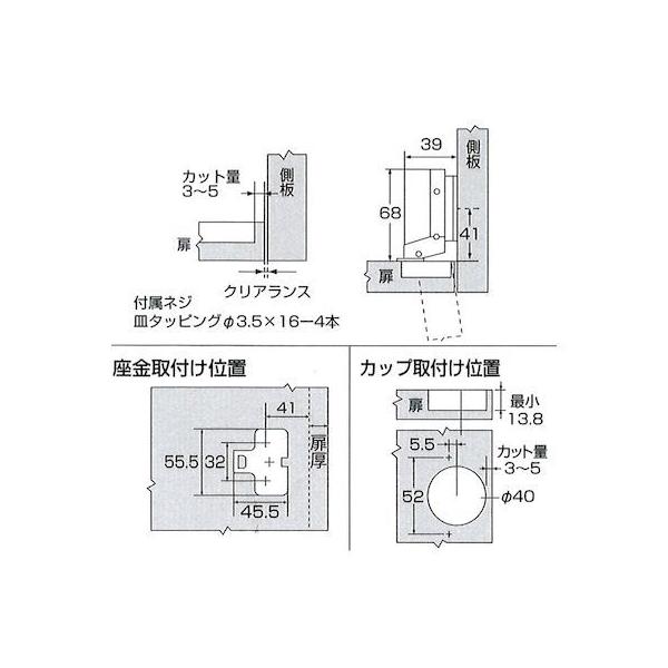 【商品説明】●ピタッと閉まるキャッチ付●開き角度2段階105°/85°●らくちん微調整 3次元調整●ワンタッチ着脱【商品用途】●扉の丁番に。【注意】●一個だけが壊れた場合でもその扉についているすべての丁番を取り替えてください。●扉の上下で違うメーカーの丁番を付けると破損の原因となります。●板が反っていたり特殊な丁番等、取替えが困難な場合もありますので、よくご確認ください。●取り付ける際、怪我をされないようご注意ください。●適合しないものも一部ございますので、よく確認してから取り付けてください。【仕様】●キャッチ付き●かぶせ:インセット【商品サイズ】●カップの径:40mm●カップの深さ:13.8mm【材質】●スチール(ニッケルメッキ仕上)
