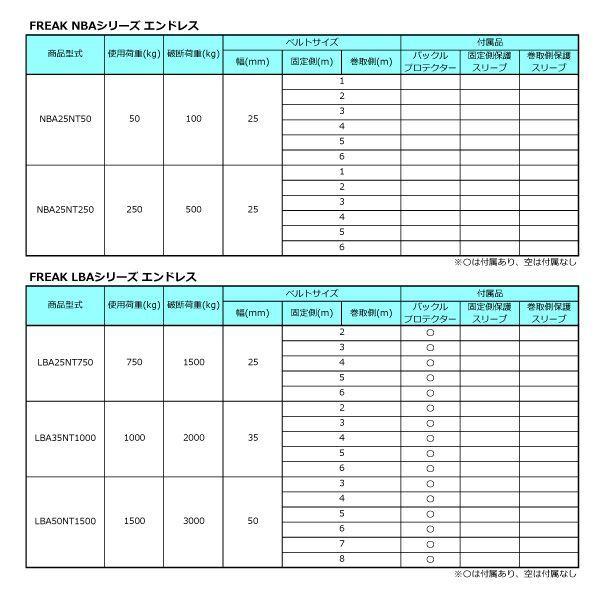 【商品説明】【仕様】・商品名:FREAKラッシングベルト青・型式:LBA50NT1500・バックル形状:ラチェット式・先端形状:エンドレス・最大使用荷重:1500kgf・破断荷重:3000kgf・安全係数:2(最大使用荷重×2=破断荷重)・ベルトサイズ:幅50mm×長さ5m・ベルト材質:ポリエステル100%・付属品:バックルプロテクター×1・欧州CE規格+GS&TUVマーク取得商品・生産物賠償責任保険(PL保険)付・販売元:株式会社フリーク【用途】トラック・陸海運業界・パレットなどの運搬、荷崩れ防止はもちろん、オートバイ・アウトドア・スポーツ用品の搬送にも最適。近年発生の多い地震やゲリラ豪雨・台風の安全対策グッズとしてもお勧めです。【安全上のご注意】1、誤った操作や日頃の点検を怠れば、荷の落下など危険な状態になります。2、使用方法・使用荷重を考慮し、余裕のある製品を選定してください。3、本製品で玉掛作業はできません。4、本製品は、化学薬品用ならびに耐熱用ではありません。5、付属の説明書をいつでも読めるように保管し、熟読してからご使用ください。6、注意事項を守らず、誤った使用上の事故や損害について、当社は一切の責任を負いません。ラチェットバックル式ラウンドタイプのラッシングベルト、握り易いバックルと柔軟強度な繊維ベルトで荷に優しく簡単安全に荷締め作業ができます。トラックの荷物運搬に大人気の「FREAKラッシングベルト LBA50NT1500 シリーズ」使用頻度も高く安価で何度も使えるおすすめの荷締め機です。