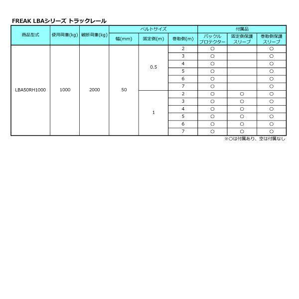 【商品説明】【仕様】・商品名:FREAKラッシングベルト青・型式:LBA50RH1000・バックル形状:ラチェット式・先端形状:レール・最大使用荷重:1000kgf・破断荷重:2000kgf・安全係数:2(最大使用荷重×2=破断荷重)・ベルトサイズ:幅50mm×固定側長さ1m+巻取側長さ3m・ベルト材質:ポリエステル100%・付属品:保護スリーブ×2、バックルプロテクター×1・欧州CE規格+GS&TUVマーク取得商品・生産物賠償責任保険(PL保険)付・販売元:株式会社フリーク【用途】トラック・陸海運業界・パレットなどの運搬、荷崩れ防止はもちろん、オートバイ・アウトドア・スポーツ用品の搬送にも最適。近年発生の多い地震やゲリラ豪雨・台風の安全対策グッズとしてもお勧めです。【安全上のご注意】1、誤った操作や日頃の点検を怠れば、荷の落下など危険な状態になります。2、使用方法・使用荷重を考慮し、余裕のある製品を選定してください。3、本製品で玉掛作業はできません。4、本製品は、化学薬品用ならびに耐熱用ではありません。5、付属の説明書をいつでも読めるように保管し、熟読してからご使用ください。6、注意事項を守らず、誤った使用上の事故や損害について、当社は一切の責任を負いません。ラチェットバックル式ワンピースのラッシングベルト、握り易いバックルと柔軟強度な繊維ベルトで荷に優しく簡単安全に荷締め作業ができます。トラックの荷物運搬に大人気の「FREAKラッシングベルト LBA50RH1000 シリーズ」使用頻度も高く安価で何度も使えるおすすめの荷締め機です。