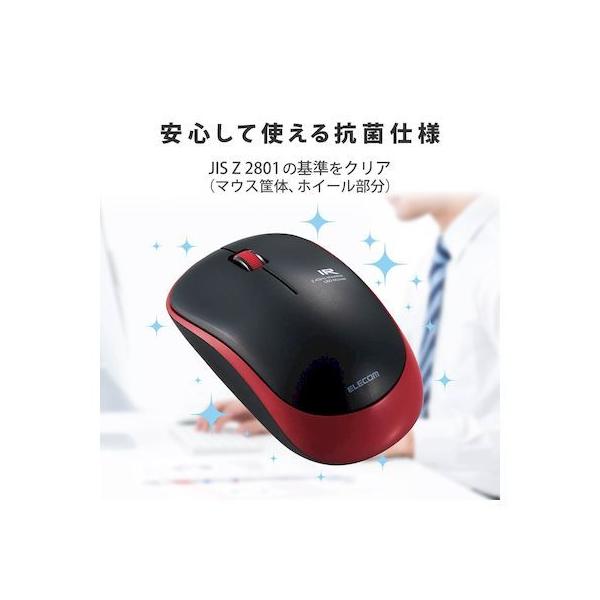 エレコムメーカーお問い合わせ:0120-898-794【商品説明】●消費電力の小さな赤外線LEDを使用したワイヤレスIR LEDマウス。●Blue LEDやレーザーを使用したマウスよりも消費電力が小さいため、約2.5年間電池を取り替えずに使用することが可能です。●財団法人日本規格協会(JSA)が定める抗菌性試験に準拠し、表面上における細菌の増殖を抑制、あるいは阻害する性能を持つ抗菌仕様です。●左右対称で持ち方を選ばないシンメトリーデザインを採用しています。●無線方式は2.4GHz帯を採用し、非磁性体で約10m、スチールデスクなど磁性体上でも約3mの範囲で使用可能です。(当社調べ)●ノートパソコンのUSBポートに接続しても気にならず、装着したまま持ち運び可能な1円玉サイズのマイクロレシーバを採用しています。●レシーバはマウス本体内に収納できるため、持ち運び時のレシーバの紛失を防ぎます。●スムーズな操作を実現する分解能1200カウントです。●本体裏面に電源スイッチがあり、不使用時の電池の消耗を防止できます。