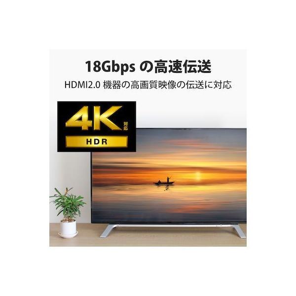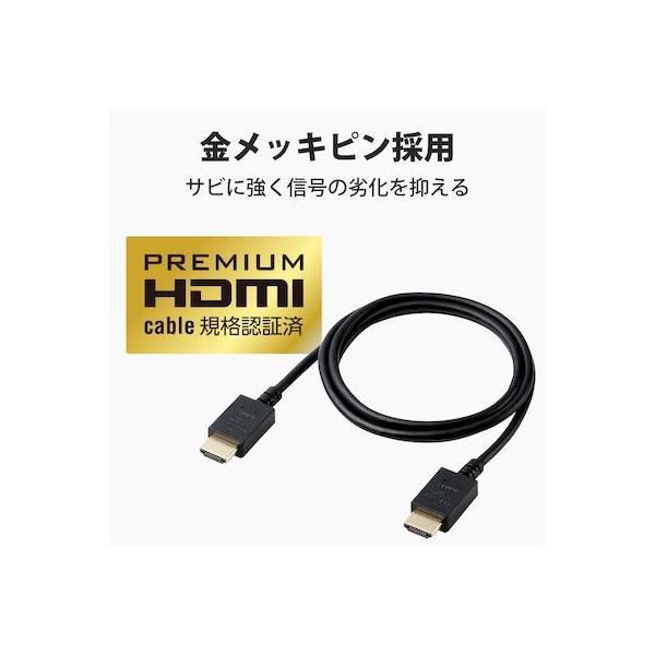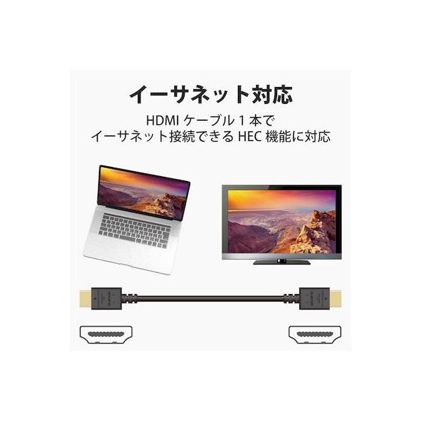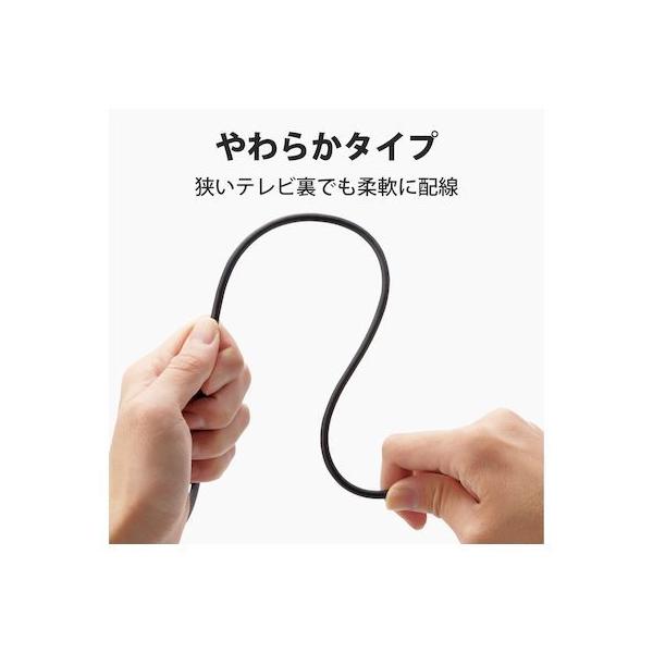 エレコムメーカーお問い合わせ:0120-898-794【商品説明】●18Gbpsの高速伝送で高画質映像と音声を充実に伝送できるPremium HDMI cable規格認証済みイーサネット対応Premium HDMIケーブルのやわらかタイプです。●4K/Ultra HDおよび3DフルHD対応のPremium HDMI cable規格認証済ケーブルです。●配線時に取り回しがしやすく、束ねてもクセが残りにくい、やわらかケーブルを採用しています。テレビやレコーダーの裏など狭い場所でも柔軟に配線でき、コネクタにかかる負担を軽減できます。●接続機器の多いテレビ裏でも干渉せず接続できる小型コネクタを採用しています。●小形コネクタ採用により配線時の省スペース化が図れます。●4K2K(60P)に対応し、滑らかな高解像度映像を伝送可能です。●明暗差を活かした立体感のある映像を伝送することができるHDRに対応しています。●従来のBT.709に比べ、より広い色域をカバーしたBT.2020映像の伝送が可能です。●1本のケーブルで、映像信号と音声信号をデジタルのままで高速伝送するだけでなく、イーサネット信号の双方向通信を実現します。●100Mbpsのイーサネット通信を実現する、HEC(HDMIイーサネットチャンネル)に対応しています。●デジタル音声をテレビなどの表示機器からAVアンプなどの出力機器へ伝送できる、ARC(オーディオリターンチャンネル)に対応しています。●外部からのノイズ侵入を軽減する高周波ノイズ用シールドと、低周波ノイズ用シールドを組み合わせた3重シールド構造です。●ノイズを軽減させる効果のある金属シェルコネクタを採用しています。●サビなどに強く信号劣化を抑える金メッキプラグを採用しています。●EUの「RoHS指令(電気・電子機器に対する特定有害物質の使用制限)」に準拠(10物質)しています。