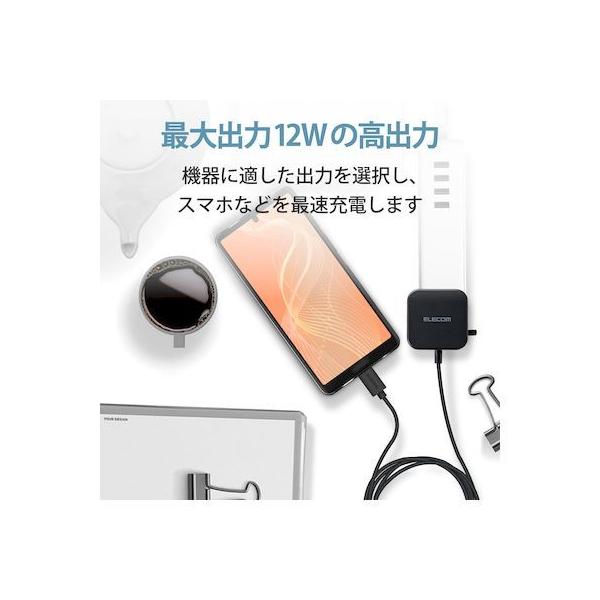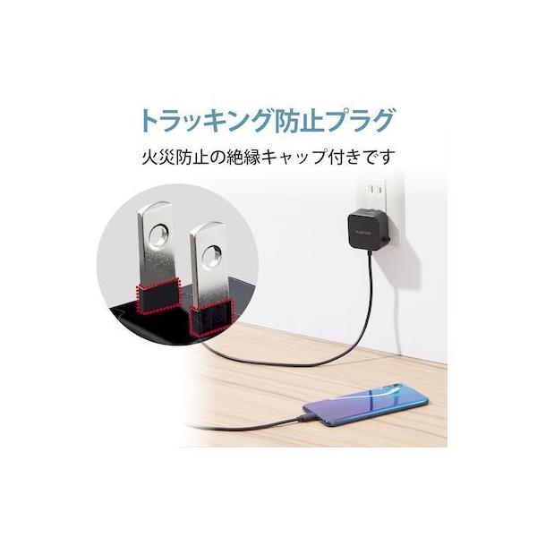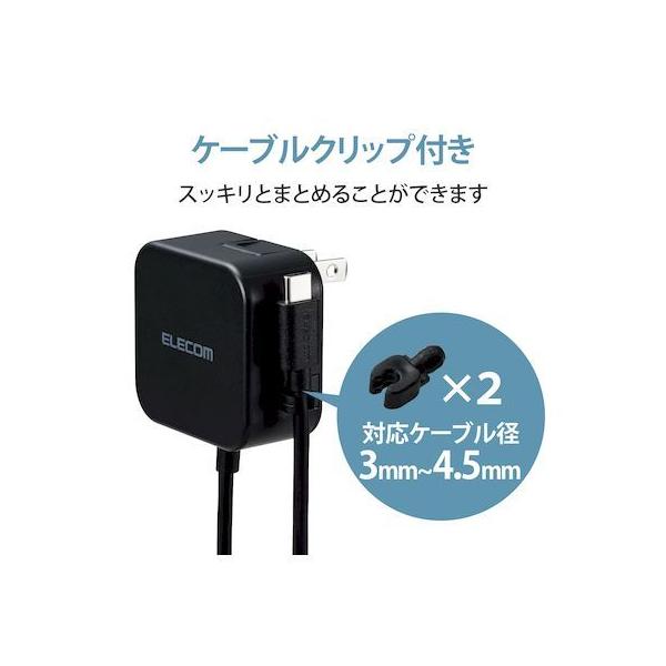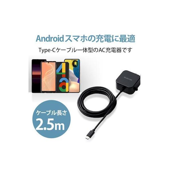 エレコムメーカーお問い合わせ:0120-898-794【商品説明】●家庭用コンセントからスマートフォンやタブレットなどのUSB Type-C(USB-C)コネクタ搭載機器を充電できるAC充電器です。●ケーブルクリップが付属し、煩雑になりがちなケーブルを本体に留めておけます。●家庭用コンセントからスマートフォンやUSB Type-C(USB-C)コネクタ搭載機器にそのまま接続して充電できるケーブル一体型です。●USB Type-C(USB-C)コネクタはウラ、オモテに関係なくケーブルを挿し込めます。●リビングでもゆったり接続できるケーブル長2.5mです。●未使用時は電源プラグを折りたたんで充電器本体に収納可能です。スッキリとコンパクトに収納できるので、持ち運びにも便利です。●トラッキング現象による火災の防止に役立つ、絶縁キャップ付きのコンセントプラグを採用しています。●※端末本体や充電器が濡れた状態で充電すると、異常な発熱・焼損の原因となり大変危険ですのでおやめください。
