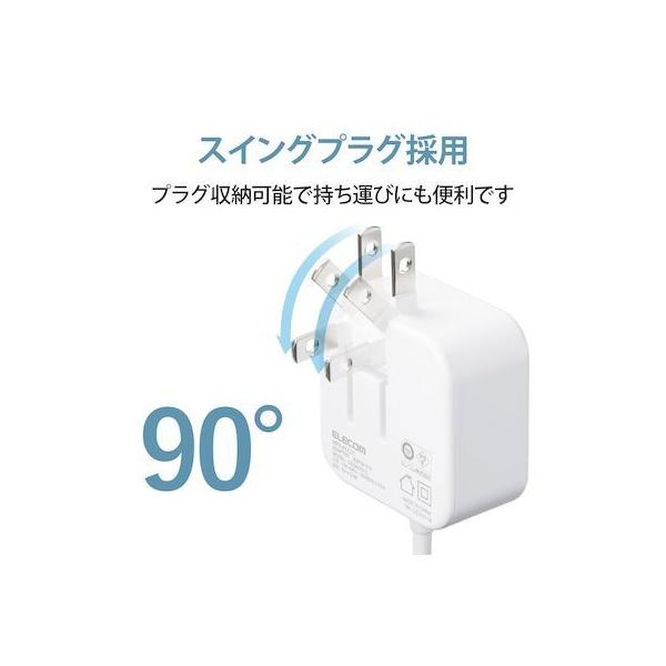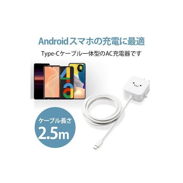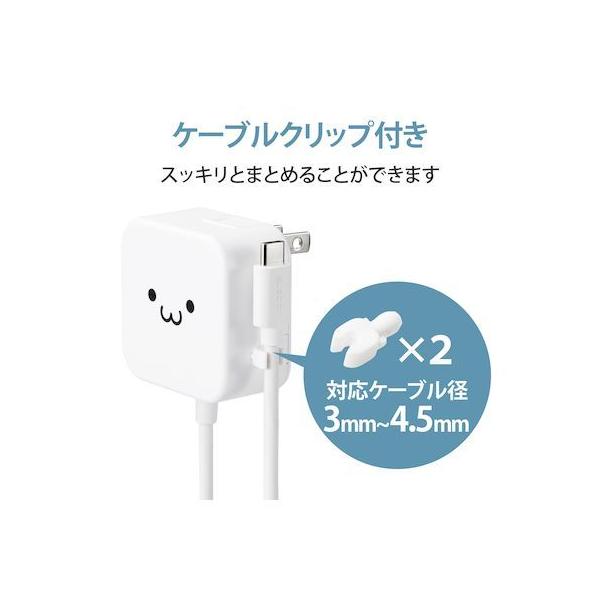 エレコムメーカーお問い合わせ:0120-898-794【商品説明】●家庭用コンセントからスマートフォンやタブレットなどのUSB Type-C(USB-C)コネクタ搭載機器を充電できるAC充電器です。●ケーブルクリップが付属し、煩雑になりがちなケーブルを本体に留めておけます。●家庭用コンセントからスマートフォンやUSB Type-C(USB-C)コネクタ搭載機器にそのまま接続して充電できるケーブル一体型です。●USB Type-C(USB-C)コネクタはウラ、オモテに関係なくケーブルを挿し込めます。●リビングでもゆったり接続できるケーブル長2.5mです。●未使用時は電源プラグを折りたたんで充電器本体に収納可能です。スッキリとコンパクトに収納できるので、持ち運びにも便利です。●トラッキング現象による火災の防止に役立つ、絶縁キャップ付きのコンセントプラグを採用しています。●※端末本体や充電器が濡れた状態で充電すると、異常な発熱・焼損の原因となり大変危険ですのでおやめください。