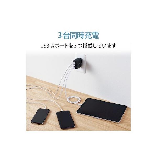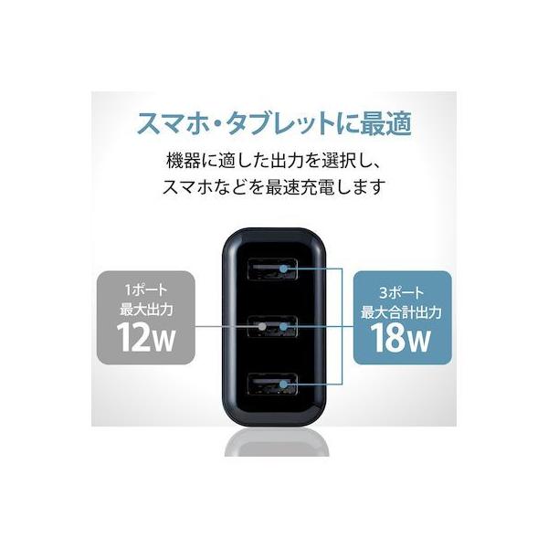 エレコムメーカーお問い合わせ:0120-898-794【商品説明】●家庭用コンセントからスマートフォンやタブレット等を充電、給電できるAC充電器です。●出力端子が3ポートありますので、スマートフォンなどを3台同時に充電が可能です。●1ポート最大出力12W(5V/2.4A)、合計最大出力18W(5V/3.6A)の高出力タイプです。●※全ポート合計の電流値を超えた場合、保護回路が動作しすべての端子で充電できなくなる場合があります。●接続された機器を自動検知し、最速電流で充電できるおまかせ充電に対応しています。●スマートフォン等に付属もしくは対応する充電用USBケーブルを使用して充電可能です。※本製品に充電用ケーブルは付属していません。●未使用時は電源プラグを折りたたんで充電器本体に収納可能です。スッキリとコンパクトに収納できるので、持ち運びにも便利です。●トラッキング現象による火災の防止に役立つ、絶縁キャップ付きのコンセントプラグを採用しています。●※端末本体や充電器が濡れた状態で充電すると、異常な発熱・焼損の原因となり大変危険ですのでおやめください。