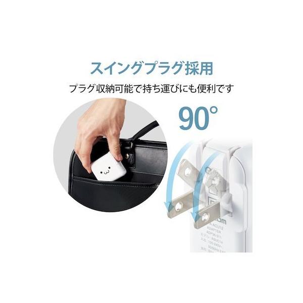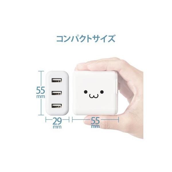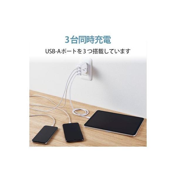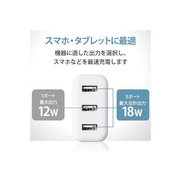 エレコムメーカーお問い合わせ:0120-898-794【商品説明】●家庭用コンセントからスマートフォンやタブレット等を充電、給電できるAC充電器です。●出力端子が3ポートありますので、スマートフォンなどを3台同時に充電が可能です。●1ポート最大出力12W(5V/2.4A)、合計最大出力18W(5V/3.6A)の高出力タイプです。●※全ポート合計の電流値を超えた場合、保護回路が動作しすべての端子で充電できなくなる場合があります。●接続された機器を自動検知し、最速電流で充電できるおまかせ充電に対応しています。●スマートフォン等に付属もしくは対応する充電用USBケーブルを使用して充電可能です。※本製品に充電用ケーブルは付属していません。●未使用時は電源プラグを折りたたんで充電器本体に収納可能です。スッキリとコンパクトに収納できるので、持ち運びにも便利です。●トラッキング現象による火災の防止に役立つ、絶縁キャップ付きのコンセントプラグを採用しています。●※端末本体や充電器が濡れた状態で充電すると、異常な発熱・焼損の原因となり大変危険ですのでおやめください。