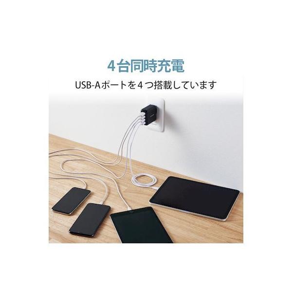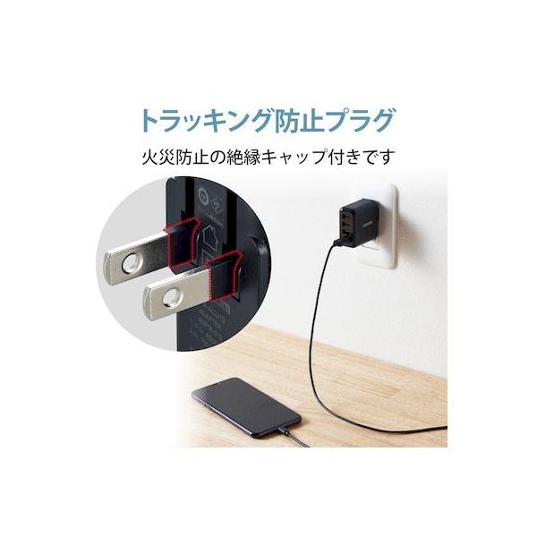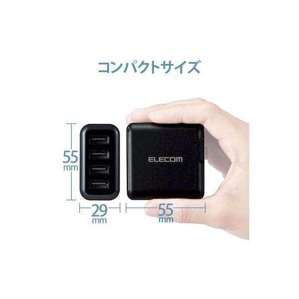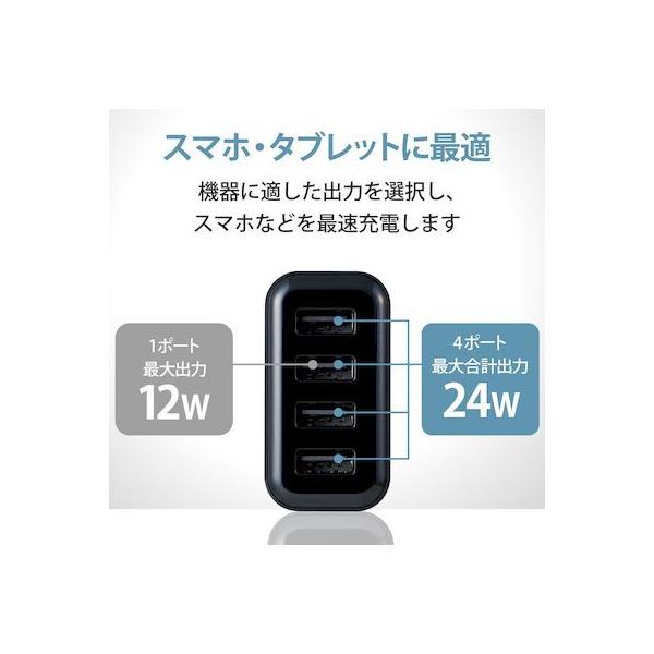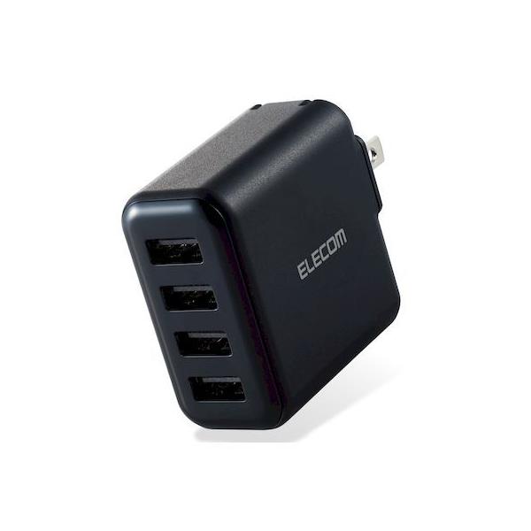 エレコムメーカーお問い合わせ:0120-898-794【商品説明】●家庭用コンセントからスマートフォンやタブレット等を充電、給電できるAC充電器です。●出力端子が4ポートありますので、スマートフォンなどを4台同時に充電が可能です。●1ポート最大出力12W(5V/2.4A)、合計最大出力24W(5V/4.8A)の高出力タイプです。●※全ポート合計の電流値を超えた場合、保護回路が動作しすべての端子で充電できなくなる場合があります。●接続された機器を自動検知し、最速電流で充電できるおまかせ充電に対応しています。●スマートフォン等に付属もしくは対応する充電用USBケーブルを使用して充電可能です。※本製品に充電用ケーブルは付属していません。●未使用時は電源プラグを折りたたんで充電器本体に収納可能です。スッキリとコンパクトに収納できるので、持ち運びにも便利です。●トラッキング現象による火災の防止に役立つ、絶縁キャップ付きのコンセントプラグを採用しています。●※端末本体や充電器が濡れた状態で充電すると、異常な発熱・焼損の原因となり大変危険ですのでおやめください。