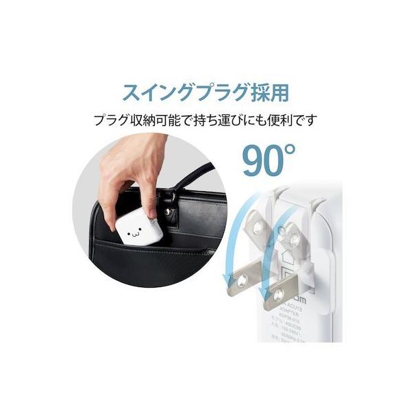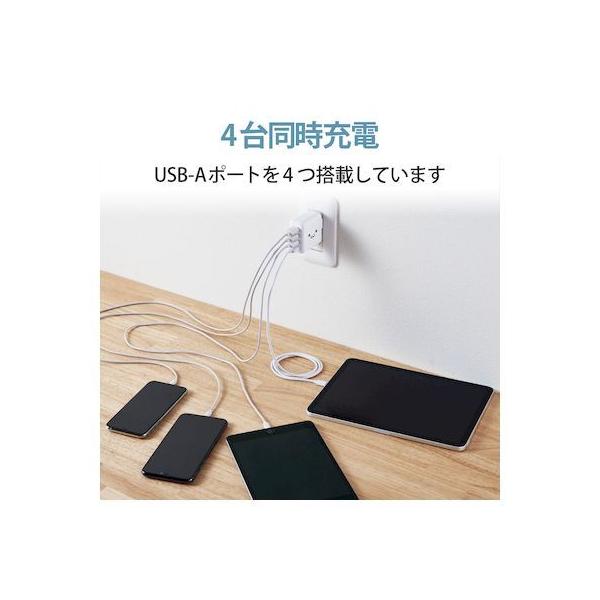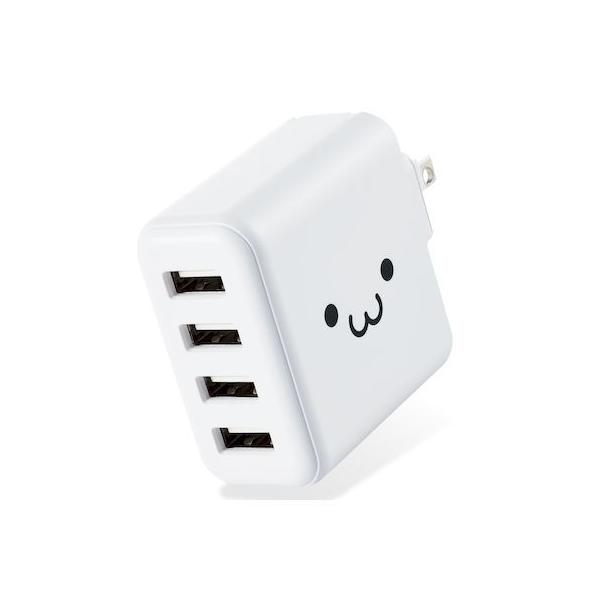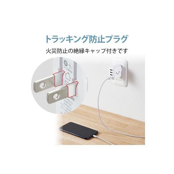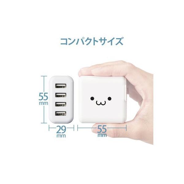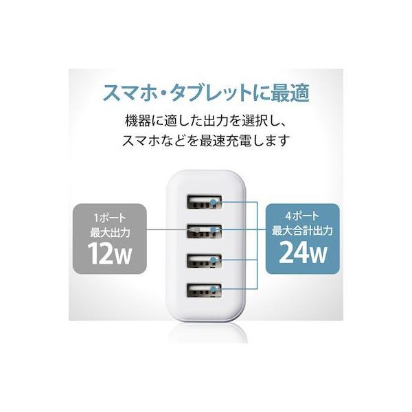 エレコムメーカーお問い合わせ:0120-898-794【商品説明】●家庭用コンセントからスマートフォンやタブレット等を充電、給電できるAC充電器です。●出力端子が4ポートありますので、スマートフォンなどを4台同時に充電が可能です。●1ポート最大出力12W(5V/2.4A)、合計最大出力24W(5V/4.8A)の高出力タイプです。●※全ポート合計の電流値を超えた場合、保護回路が動作しすべての端子で充電できなくなる場合があります。●接続された機器を自動検知し、最速電流で充電できるおまかせ充電に対応しています。●スマートフォン等に付属もしくは対応する充電用USBケーブルを使用して充電可能です。※本製品に充電用ケーブルは付属していません。●未使用時は電源プラグを折りたたんで充電器本体に収納可能です。スッキリとコンパクトに収納できるので、持ち運びにも便利です。●トラッキング現象による火災の防止に役立つ、絶縁キャップ付きのコンセントプラグを採用しています。●※端末本体や充電器が濡れた状態で充電すると、異常な発熱・焼損の原因となり大変危険ですのでおやめください。