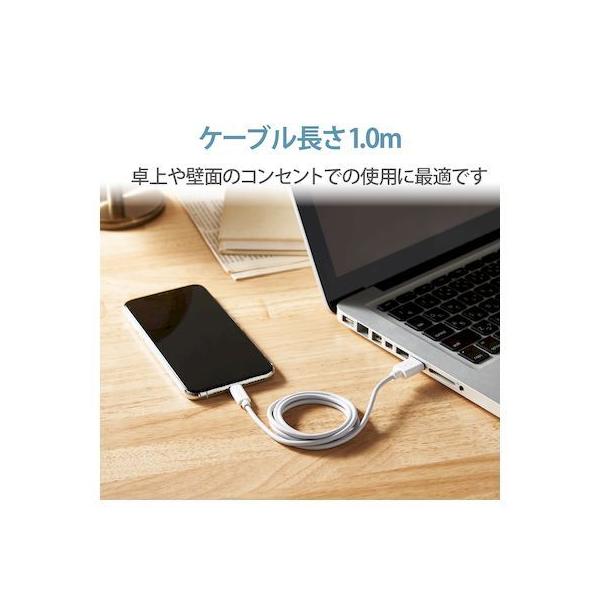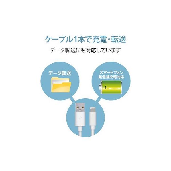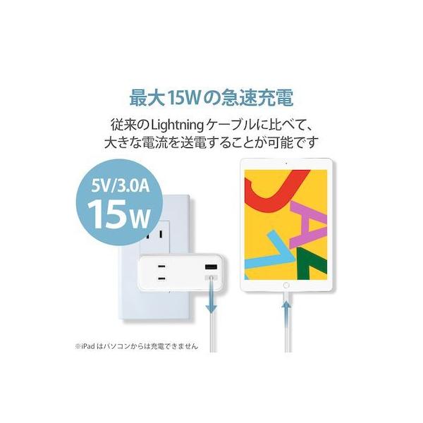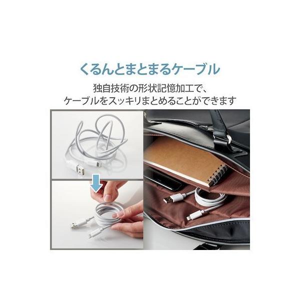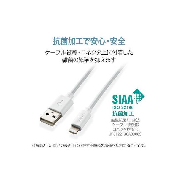 エレコムメーカーお問い合わせ:0120-898-794【商品説明】●iPhoneやiPod、iPadなどのLightningコネクタ搭載機器とUSB-A端子を搭載しているパソコンを接続し、充電・データ通信が可能なLightningケーブルです。※iPadはパソコンからは充電できません。●Apple社製品に対応したUSB-Aポート付きの充電器との接続で、家庭用コンセントから充電可能です。●独自技術の形状記憶加工ケーブル(※)で、使わないときや収納・持ち運びの際にケーブルをスッキリまとめることができます。(※特許出願中)●抗菌加工により、ケーブル被覆・コネクタ上に付着した雑菌の繁殖を抑えます。●こちらの製品は表面上における細菌の増殖を抑制、あるいは阻害する性能を有したもので、財団法人日本規格協会(JSA)が定める抗菌性試験に準拠したものです。●※抗菌とは、製品の表面上に存在する細菌の増殖を抑制することです。JIS(日本産業規格)では抗菌加工されていない製品の表面と比較して、細菌を99%以上抑制出来ている場合、その製品に抗菌効果があると規定しています。●最大15W(5V/3A)の大電流で接続機器の充電が可能です。 ※ご使用になるパソコンなどの性能によって、供給される電流値が異なります。USB PD(Power-Delivery)非対応です。●サビなどに強く、信号劣化を抑える金メッキピンを採用しています。●※スリムタイプコネクタ[9.6×6.1mm]を採用していますが、万が一ケースなどが干渉し挿入しにくい場合は、ケースなどを外してご使用ください。●EUの「RoHS指令(電気・電子機器に対する特定有害物質の使用制限)」に準拠(10物質)した、環境にやさしい製品です。●ゴミの少ない簡易パッケージです。