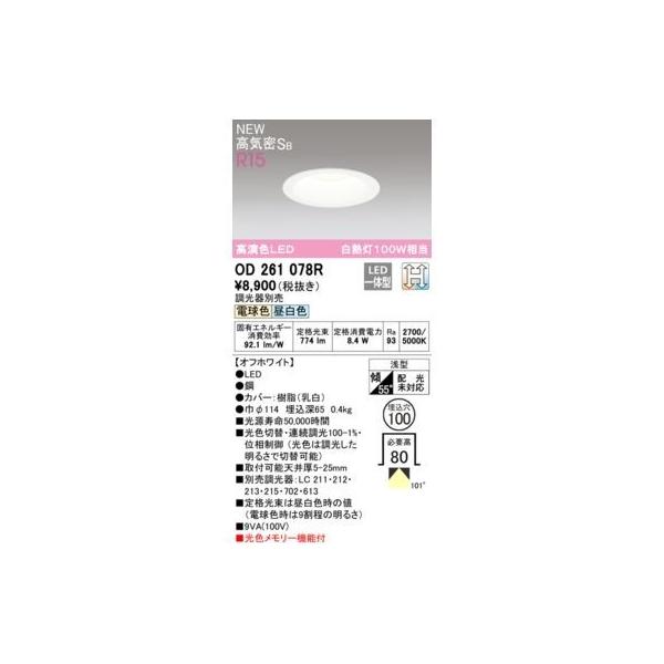 オーデリックメーカーお問い合わせ:03-3332-1123【商品説明】調光器別売 消費電力8.4W Ra94 【オフホワイト】 ●LED ●バー:樹脂(乳白) ●巾φ114 埋込深65 0.4kg ●光源寿命50,000時間 ●光色切替・連続調光100-1%・位相制御 (光色は調光した明るさで切替可能) ●取付可能天井厚5-25mm ●定格光束は昼白色時の値(電球色時は9割程の明るさ) ●光色メモリー機能付 浅型 傾斜55°(配光傾斜未対応) その他 ベース_拡散