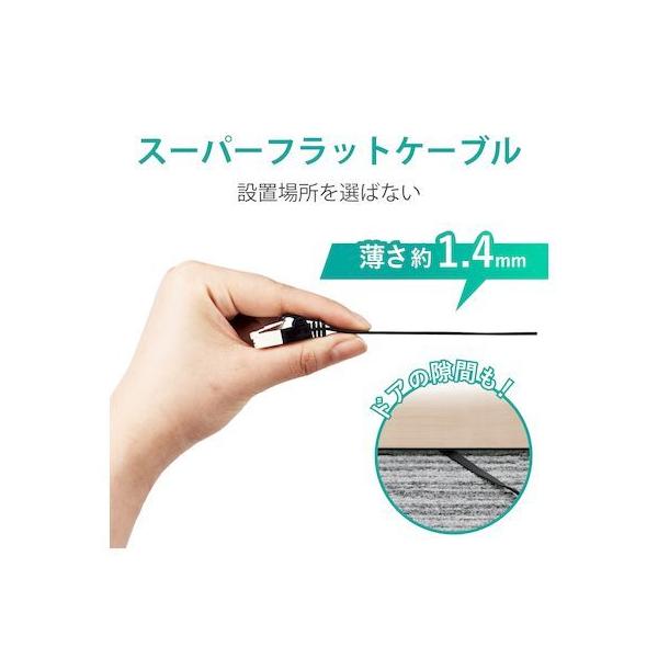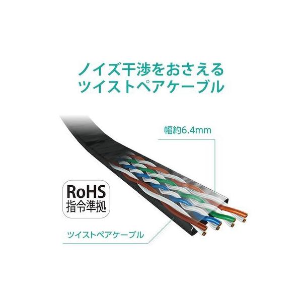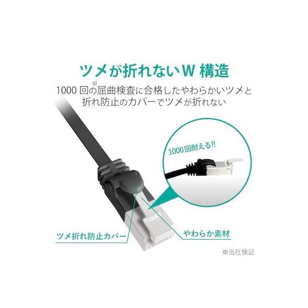 エレコムメーカーお問い合わせ:0120-898-794【商品説明】●ツメ折れ防止プロテクタと屈曲に対する耐久性が高い新素材コネクタを採用したダブル構造で、通常の使用環境では絶対にツメが折れないLANケーブルです。※1000回の屈曲検査に合格(当社検証)●ツメ折れによるケーブルの脱落を防止し、長期にわたってしっかりとLANポートに固定することができます。●高速光通信に最適な、10ギガビット・イーサネットの「10GBASE-T」に対応したカテゴリー6Aに準拠しています。●カテゴリー6の2倍である500MHzまでの高周波領域まで対応しており、ノイズ干渉にも強く、高速で安定したネットワーク環境を実現します。●カーペットの下やドアのすき間に配線できる薄さ約1.45mm、幅約6.0mmのフラットタイプです。●柔らかく取り回しがしやすいツイストペア(ヨリ対線)仕様なので、狭い場所での敷設も容易です。●隣接するポートに干渉することがないスリムコネクタを採用しています。●EUの「RoHS指令(電気・電子機器に対する特定有害物質の使用制限)」に準拠(10物質)した、環境にやさしい製品です。