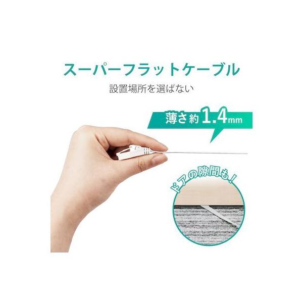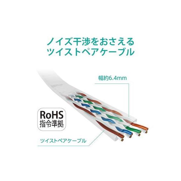 エレコムメーカーお問い合わせ:0120-898-794【商品説明】●ツメ折れ防止プロテクタと屈曲に対する耐久性が高い新素材コネクタを採用したダブル構造で、通常の使用環境では絶対にツメが折れないLANケーブルです。※1000回の屈曲検査に合格(当社検証)●ツメ折れによるケーブルの脱落を防止し、長期にわたってしっかりとLANポートに固定することができます。●高速光通信に最適な、10ギガビット・イーサネットの「10GBASE-T」に対応したカテゴリー6Aに準拠しています。●カテゴリー6の2倍である500MHzまでの高周波領域まで対応しており、ノイズ干渉にも強く、高速で安定したネットワーク環境を実現します。●カーペットの下やドアのすき間に配線できる薄さ約1.45mm、幅約6.0mmのフラットタイプです。●柔らかく取り回しがしやすいツイストペア(ヨリ対線)仕様なので、狭い場所での敷設も容易です。●隣接するポートに干渉することがないスリムコネクタを採用しています。●EUの「RoHS指令(電気・電子機器に対する特定有害物質の使用制限)」に準拠(10物質)した、環境にやさしい製品です。