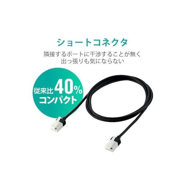 エレコムメーカーお問い合わせ:0120-898-794【商品説明】●屈曲に対する耐久性が高い新素材コネクタを採用し、通常の使用環境では絶対にツメが折れないLANケーブルです。 ※1000回の屈曲検査に合格(当社検証)●ツメ折れによるケーブルの脱落を防止し、長期にわたってしっかりとLANポートに固定することができます。●カテゴリー6Aに準拠したスーパースリムLANケーブルです。●高速光通信に最適な、10ギガビット・イーサネットの「10GBASE-T」に対応しています。●カテゴリー6の2倍である500MHzまでの高周波領域まで対応しており、ノイズ干渉にも強く、高速で安定したネットワーク環境を実現します。●狭い場所などでの配線に最適な、直径3.0mmのスーパースリムケーブルを採用しています。●十字介在をなくしたツイストペア(ヨリ対線)仕様なので、柔らかく取り回しが簡単で、狭い場所での敷設も容易です。●従来比約40%の新設計ショートコネクタは、隣接するポートに干渉することが無く出っ張りも気にならない、スリムかつコンパクトなコネクタです。●EUの「RoHS指令(電気・電子機器に対する特定有害物質の使用制限)」に準拠(10物質)した、環境にやさしい製品です。