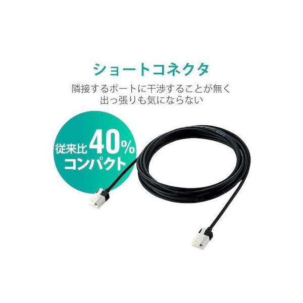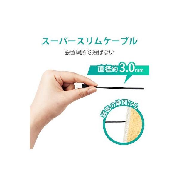 エレコムメーカーお問い合わせ:0120-898-794【商品説明】●屈曲に対する耐久性が高い新素材コネクタを採用し、通常の使用環境では絶対にツメが折れないLANケーブルです。 ※1000回の屈曲検査に合格(当社検証)●ツメ折れによるケーブルの脱落を防止し、長期にわたってしっかりとLANポートに固定することができます。●カテゴリー6Aに準拠したスーパースリムLANケーブルです。●高速光通信に最適な、10ギガビット・イーサネットの「10GBASE-T」に対応しています。●カテゴリー6の2倍である500MHzまでの高周波領域まで対応しており、ノイズ干渉にも強く、高速で安定したネットワーク環境を実現します。●狭い場所などでの配線に最適な、直径3.0mmのスーパースリムケーブルを採用しています。●十字介在をなくしたツイストペア(ヨリ対線)仕様なので、柔らかく取り回しが簡単で、狭い場所での敷設も容易です。●従来比約40%の新設計ショートコネクタは、隣接するポートに干渉することが無く出っ張りも気にならない、スリムかつコンパクトなコネクタです。●EUの「RoHS指令(電気・電子機器に対する特定有害物質の使用制限)」に準拠(10物質)した、環境にやさしい製品です。