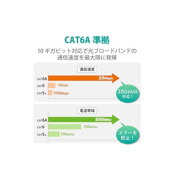エレコムメーカーお問い合わせ:0120-898-794【商品説明】●ツメ折れ防止プロテクタと屈曲に対する耐久性が高い新素材コネクタを採用したダブル構造で、通常の使用環境では絶対にツメが折れないLANケーブルです。※1000回の屈曲検査に合格(当社検証)●ツメ折れによるケーブルの脱落を防止し、長期にわたってしっかりとLANポートに固定することができます。●カテゴリー6Aに対応したスタンダードなLANケーブルです。●高速光通信に最適な、10ギガビット・イーサネットの「10GBASE-T」に対応しています。●カテゴリー6の2倍である500MHzまでの高周波領域まで対応しており、ノイズ干渉にも強く、高速で安定したネットワーク環境を実現します。●1000BASE-TX/1000BASE-T/100BASE-Tといった環境でも安定したデータ転送速度を確保します。●ケーブル内に十字介材を入れることで信号の干渉を防止し、安定したデータ転送を実現します。●単線に比べてやわらかく、取り回しがしやすいツイストペア(ヨリ対線)仕様です。●EUの「RoHS指令(電気・電子機器に対する特定有害物質の使用制限)」に準拠(10物質)した、環境にやさしい製品です。