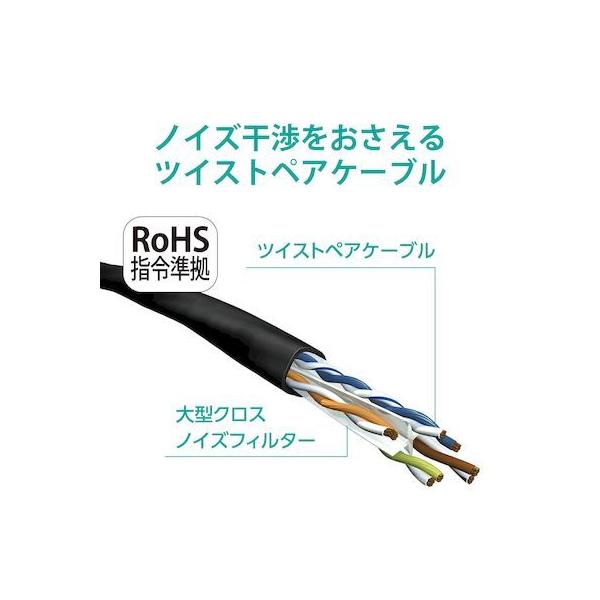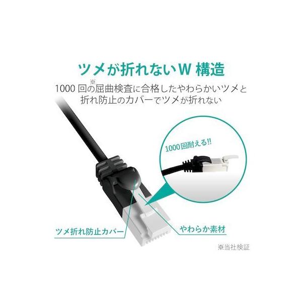 エレコムメーカーお問い合わせ:0120-898-794【商品説明】●ツメ折れ防止プロテクタと屈曲に対する耐久性が高い新素材コネクタを採用したダブル構造で、通常の使用環境では絶対にツメが折れないLANケーブルです。※1000回の屈曲検査に合格(当社検証)●ツメ折れによるケーブルの脱落を防止し、長期にわたってしっかりとLANポートに固定することができます。●カテゴリー6Aに対応したスタンダードなLANケーブルです。●高速光通信に最適な、10ギガビット・イーサネットの「10GBASE-T」に対応しています。●カテゴリー6の2倍である500MHzまでの高周波領域まで対応しており、ノイズ干渉にも強く、高速で安定したネットワーク環境を実現します。●1000BASE-TX/1000BASE-T/100BASE-Tといった環境でも安定したデータ転送速度を確保します。●ケーブル内に十字介材を入れることで信号の干渉を防止し、安定したデータ転送を実現します。●単線に比べてやわらかく、取り回しがしやすいツイストペア(ヨリ対線)仕様です。●EUの「RoHS指令(電気・電子機器に対する特定有害物質の使用制限)」に準拠(10物質)した、環境にやさしい製品です。