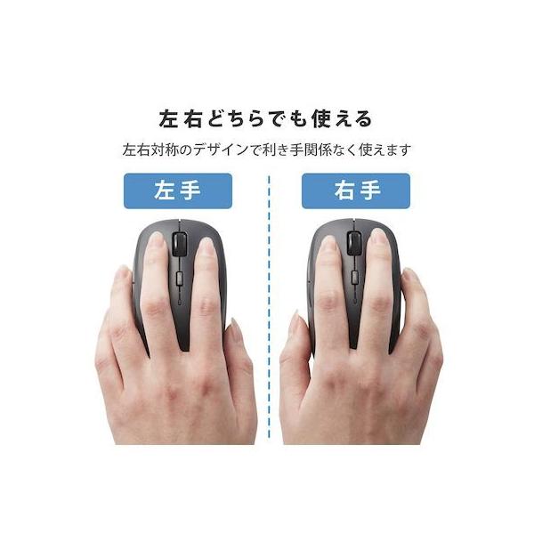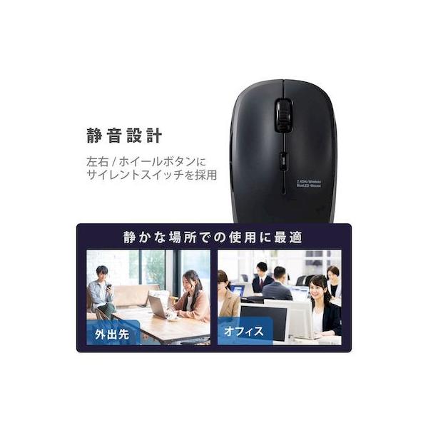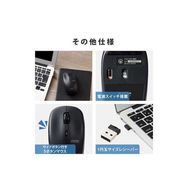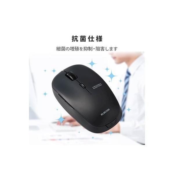 エレコムメーカーお問い合わせ:0120-898-794【商品説明】●ネットの閲覧などの操作に便利な「進む」・「戻る」ボタンが付いた5ボタンワイヤレスBlueLEDマウス。●マウスのクリック時のカチカチ音がしない静音スイッチを採用し、音が気になる場所でも使えます。●無料でダウンロードできる「エレコムマウスアシスタント」を利用することで、各ボタンにお好みの機能を割り当てることができます。●標準的なMサイズのため、長時間使用していても手が疲れにくく、オフィスでの利用にも最適です。●財団法人日本規格協会(JSA)が定める抗菌性試験に準拠し、表面上における細菌の増殖を抑制、あるいは阻害する性能を持つ抗菌仕様です。●2.4GHz帯を採用したワイヤレスタイプで、非磁性体で約10m、スチールデスクなど磁性体上でも約3mの範囲で使用可能です。(当社調べ)●ノートパソコンのUSBポートに接続しても気にならず、装着したまま持ち運び可能な1円玉サイズのマイクロレシーバを採用しています。●レシーバはマウス本体内に収納できるため、持ち運び時のレシーバの紛失を防ぎます。●小さな凹凸やホコリでもより正確に光が反射し、場所を選ばずに快適に使用できるBlueLEDを搭載しています。●本体上部にポインタ速度変更ボタンを装備し、用途にあわせてマウスのカーソル速度を1000/1500/2000カウントの3段階に切り替え可能です。●本体裏面に電源スイッチがあり、不使用時の電池の消耗を防止できます。●電池の交換時期をお知らせする電池残量表示ランプを搭載しています。