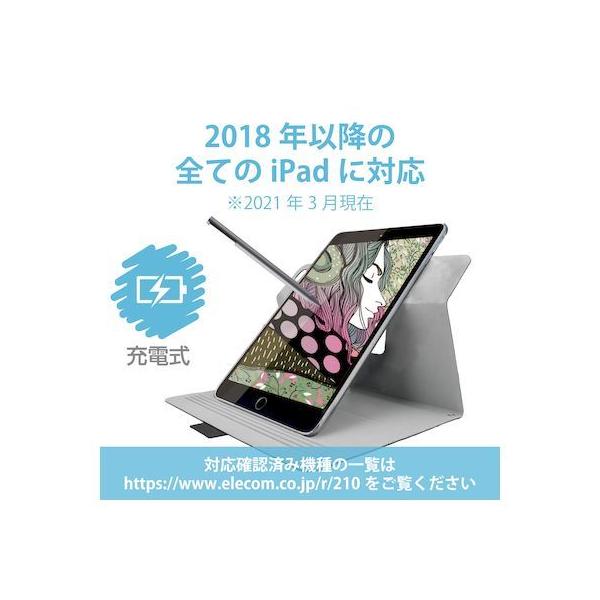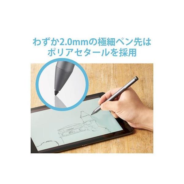 エレコムメーカーお問い合わせ:0120-898-794【商品説明】●充電可能なiPad専用のアクティブタッチペンです。●2018年以降のすべてのiPadに対応。(2021年3月現在)●※対応確認済み機種の一覧はhttps://www.elecom.co.jp/r/210をご覧ください●※iOS 12.2以降に更新する必要があります。●※iPadモデル確認手順:『設定』(歯車のアイコン)→『一般』→『情報』→『モデル』●ペン先が2.0mmと極細なので、指先でのタッチや非電池式のタッチペンでの操作に比べて繊細な描き込みができます。●ペン先とポイントの位置ズレ、レイテンシー(遅延)が大幅に改善されており、ストレス無く操作ができます。●※当社の汎用アクティブタッチペンとの比較●手のひらが画面に接触した状態でも、誤動作を防止するパームリジェクション機能があります。●※お使いのアプリによっては、パームリジェクション機能をご使用頂けないことがあります。●ペン先は導電性に優れたポリアセタールを採用、ゴムに比べて耐久性に優れており、金属に比べて液晶画面を傷つけにくい素材です。●従来品では反応しづらかったガラスフィルムの上からでもストレスなく滑らかな操作が可能です。●指先でのタッチ操作と違い、液晶画面を汚さずに操作可能です。●タッチ操作はもちろん、スライド、スワイプ操作も快適に行えます。●※液晶保護フィルムをご使用の際は、フィルムの種類によっては、操作時にこすれ音が生じたり、ペンの反応が悪くなることがあります。●面倒なペアリングなどは不要、電源をオンにするだけでご使用いただけます。●※一部のiPadにおいて、初期設定により、『メモ』アプリで手書き入力する際に、 ペン操作はApple Pencilのみに制限されており、本製品をご使用いただけない状態になっております。 その際は以下の手順で本製品をご使用いただけます。 『設定』(歯車のアイコン)→『メモ』→『Apple Pencilのみで描写』をOFFにする。●※Apple PencilとiPadがペアリングされている場合は、本製品をご使用頂けません。ペアリングを切り、ご使用下さい。●連続で約20時間、ご使用いただけます。●※ご使用状態によっては、この目安の時間よりも早く使用できなくなる場合があります。●5分間操作しない状態が続くとオートスリープ機能が働き、電源の消し忘れを防ぎます。●※オートスリープは振動感知式です。タッチペンのスイッチをオンにした状態でポケットやカバンに入れた際に振動を感知してオートスリープが動作しない場合があります。●胸ポケットなどに入れて持ち運ぶのに便利なクリップが付いています。