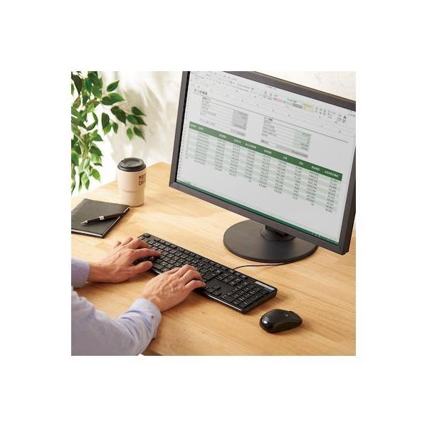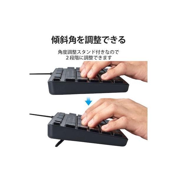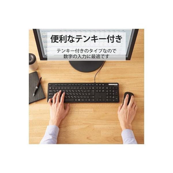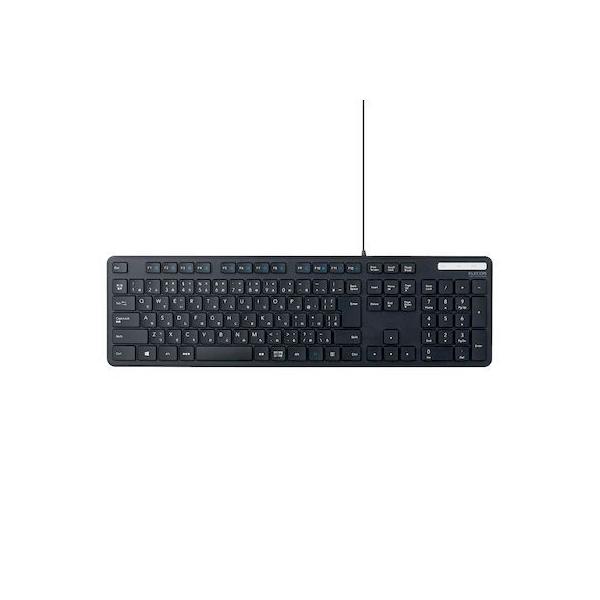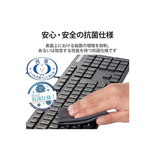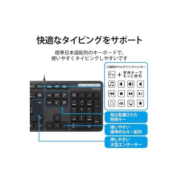 エレコムメーカーお問い合わせ:0120-898-794【商品説明】●財団法人日本規格協会(JSA)が定める抗菌性試験に準拠し、表面上における細菌の増殖を抑制、あるいは阻害する性能を持つ抗菌仕様です。●サクサクと軽い打ち心地を実現したキー設計を採用した薄型キーボードです。●キーを押した際の重さが、当社従来品と比較して約18%軽くなっており、小さい力でキー入力することができます。※TK-FDM075TBKと比較●キーストローク2.5mmの薄型キーを採用し、素早いキー入力を実現します。●最薄部は約12.7mmで、スタイリッシュな薄型設計です。●タイピングしやすい、JIS規格準拠の標準日本語配列のキーボードです。●大型のエンターキーや、独立して配置されたDeleteやInsertなどの特殊キーにより、誤入力しにくく快適なキータイピングが行えます。●Webブラウザやメディアプレーヤーの機能などを専用キーを押すだけで実行できる12種類のマルチファンクションキーを搭載しています。●Num Lock、Caps Lock、Scroll LockのON/OFFが確認できるLEDランプがついています。●電池が不要で、PCに挿すだけですぐに使用することができる有線接続タイプです。●長さ1.5mのケーブルを採用しており、デスクトップPCなどでも余裕のある配線が可能です。●数字入力に便利なテンキー付きのフルキーボードで、エクセルなどの作業を効率化します。●キートップをラバードームで支えるメンブレン方式を採用しています。●打鍵しやすいキーピッチ19mmで快適なタイピングが可能です。●姿勢に合わせて傾斜角を2段階で調整できる角度調整スタンドが付いています。●スタンドにはしっかりしたキータッチに役立つ滑り止めが付いています。