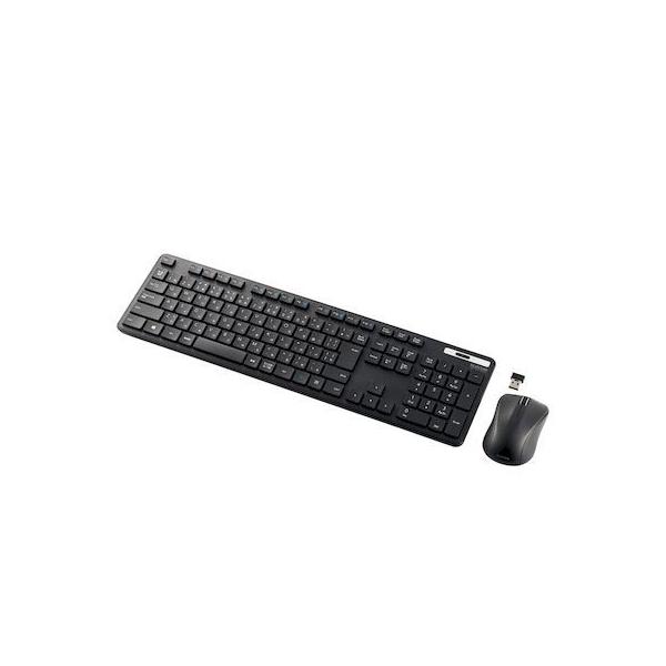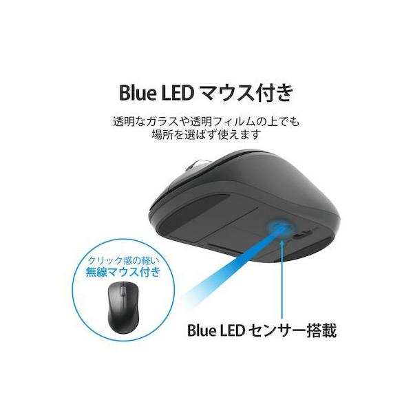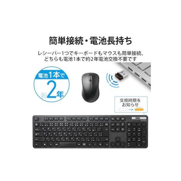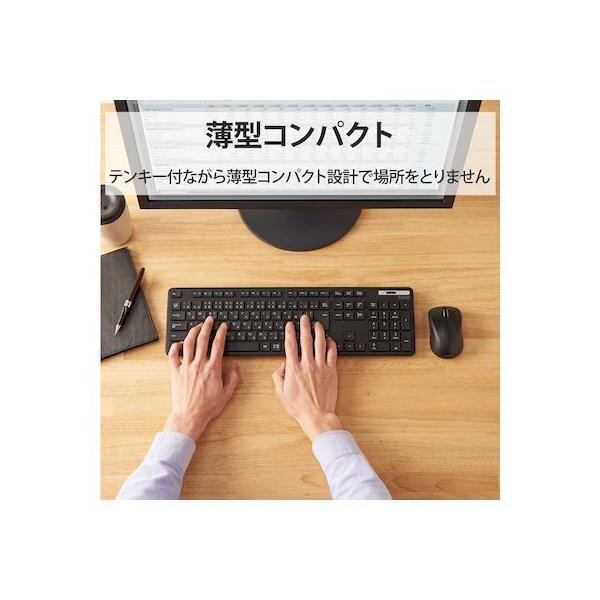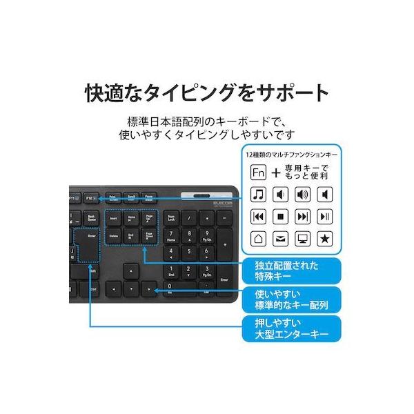 エレコムメーカーお問い合わせ:0120-898-794【商品説明】●財団法人日本規格協会(JSA)が定める抗菌性試験に準拠し、表面上における細菌の増殖を抑制、あるいは阻害する性能を持つ抗菌仕様です。●サクサクと軽い打ち心地を実現したキー設計を採用した薄型キーボードです。●キーを押した際の重さが、当社従来品と比較して約18%軽くなっており、小さい力でキー入力することができます。※TK-FDM075TBKと比較●キーストローク2.5mmの薄型キーを採用し、素早いキー入力を実現します。●最薄部は約12.7mmで、スタイリッシュな薄型設計です。●左右対称で持ち方を選ばないシンメトリーデザインを採用した無線マウスが付いています。●マウスに軽量スイッチを採用し、軽快なクリック感を実現しています。●タイピングしやすい、JIS規格準拠の標準日本語配列のキーボードです。●大型のエンターキーや、独立して配置されたDeleteやInsertなどの特殊キーにより、誤入力しにくく快適なキータイピングが行えます。●Webブラウザやメディアプレーヤーの機能などを専用キーを押すだけで実行できる12種類のマルチファンクションキーを搭載しています。●1円玉サイズのマイクロレシーバーを採用しており、パソコンのUSBポートに挿すだけで、すぐに使用することができる無線接続タイプです。●ひとつのレシーバーユニットでキーボードとマウスを接続可能です。●レシーバーはキーボードの裏面でも、マウスの裏面でも収納可能です。●キーボードは単4電池1本、マウスは単3電池1本で使用でき、それぞれ約2年間電池の交換をせずに使用可能です。(アルカリ乾電池使用時の動作時間目安※弊社環境でのテスト値であり、保証値ではありません。)●キーボード、マウスとも不使用時の電池の消耗を防止できる電源スイッチを搭載しています。●電池残量を知らせてくれるLEDランプがついています。●数字入力に便利なテンキー付きのフルキーボードで、エクセルなどの作業を効率化します。●キートップをラバードームで支えるメンブレン方式を採用しています。●打鍵しやすいキーピッチ19mmで快適なタイピングが可能です。●姿勢に合わせて傾斜角を2段階で調整できる角度調整スタンドが付いています。●スタンドにはしっかりしたキータッチに役立つ滑り止めが付いています。●マウスは小さな凹凸やホコリでもより正確に光が反射し、場所を選ばずに快適に使用できるBlueLEDを搭載しています。●マウスはさまざまな操作環境でスムーズな操作を実現する分解能1600カウントです。