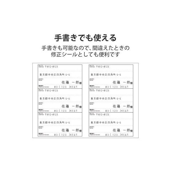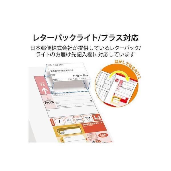 エレコムメーカーお問い合わせ:0120-898-794【商品説明】●日本郵便株式会社が提供しているレターパックのお届け先記入欄にぴったり貼れるラベルシールです。●レターパックに合わせたサイズ・デザインなので、違和感なく使用できます。●レターパックライト/プラスどちらにも対応します。●はがして貼るだけのシールなので、はさみで切ったり糊を使う必要がありません。●インクジェットプリンタ、レーザープリンタ、コピー機でも印刷できるマルチタイプのラベルです。●手書きも可能なので、間違えたときの修正シールとしても便利です。●無料でダウンロードできるエレコムのラベル作成ソフト「らくちんプリント」で、住所を入力するだけでスピーディにラベル印刷が可能です。●「らくちんプリント」を使って、表計算ソフトからの差し込み印刷も出来ます。