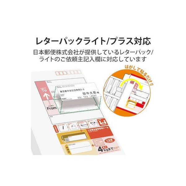 エレコムメーカーお問い合わせ:0120-898-794【商品説明】●日本郵便株式会社が提供しているレターパックのご依頼主記入欄にぴったり貼れるラベルシールです。●レターパックに合わせたサイズ・デザインなので、違和感なく使用できます。●レターパックライト/プラスどちらにも対応します。●はがして貼るだけのシールなので、はさみで切ったり糊を使う必要がありません。●インクジェットプリンタ、レーザープリンタ、コピー機でも印刷できるマルチタイプのラベルです。●手書きも可能なので、間違えたときの修正シールとしても便利です。●無料でダウンロードできるエレコムのラベル作成ソフト「らくちんプリント」で、住所を入力するだけでスピーディにラベル印刷が可能です。●「らくちんプリント」を使って、表計算ソフトからの差し込み印刷も出来ます。