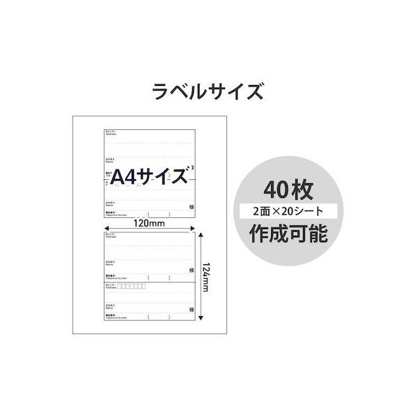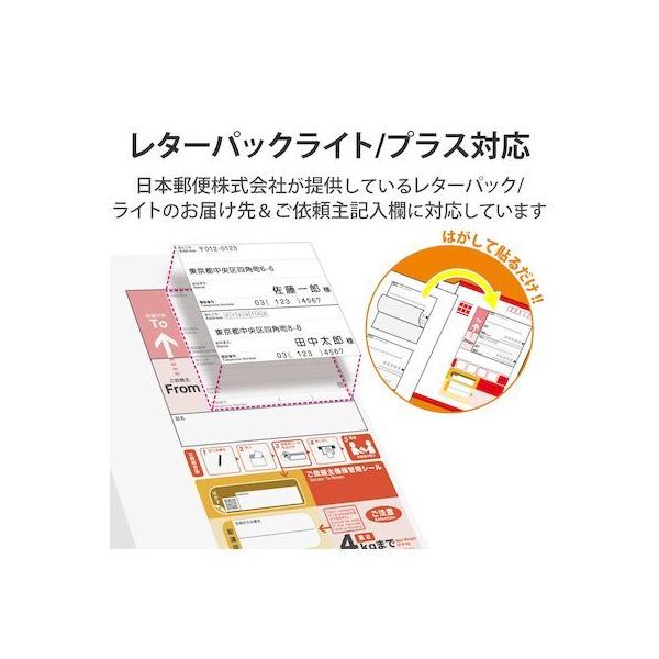 エレコムメーカーお問い合わせ:0120-898-794【商品説明】●日本郵便株式会社が提供しているレターパックのお届け先&ご依頼主記入欄にぴったり貼れるラベルシールです。●レターパックに合わせたサイズ・デザインなので、違和感なく使用できます。●レターパックライト/プラスどちらにも対応します。●はがして貼るだけのシールなので、はさみで切ったり糊を使う必要がありません。●インクジェットプリンタ、レーザープリンタ、コピー機でも印刷できるマルチタイプのラベルです。●手書きも可能なので、間違えたときの修正シールとしても便利です。●無料でダウンロードできるエレコムのラベル作成ソフト「らくちんプリント」で、住所を入力するだけでスピーディにラベル印刷が可能です。●「らくちんプリント」を使って、表計算ソフトからの差し込み印刷も出来ます。