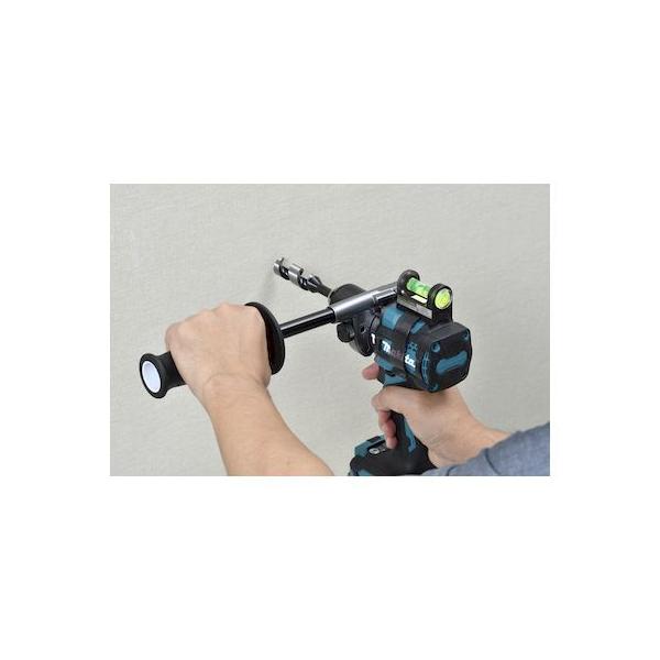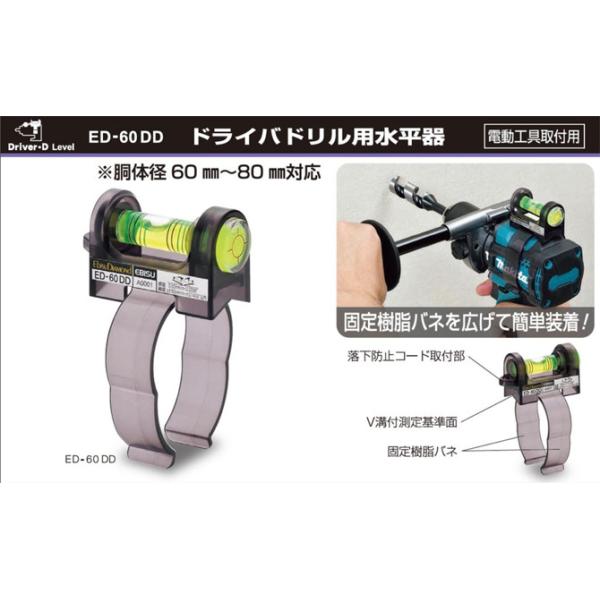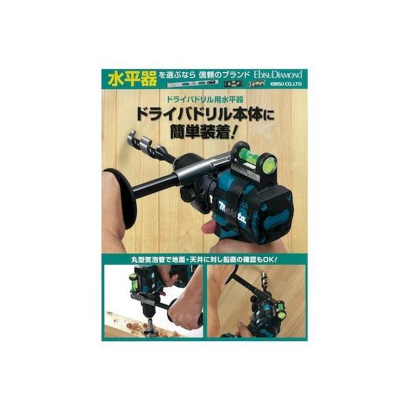 エビスメーカーお問い合わせ:0120-18-5133【商品説明】●特徴●ドリルドライバー用の水平器●本体に取り付けて水平が確認できます●丸型気泡管で地面、天井に対し鉛直の確認と穴あけが出来ます●落下防止コードの取り付けができます●蓄光付で明るい所で光を蓄積して暗い所で数分間発光します●胴体径60mm~80mm対応●仕様、規格●寸法 H98mm×W55mm●材質 特殊樹脂●感度 0.50mm/m=0.0286°●精度 ±2.50mm/m=±0.1432°以内