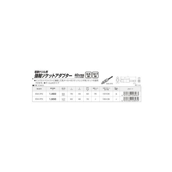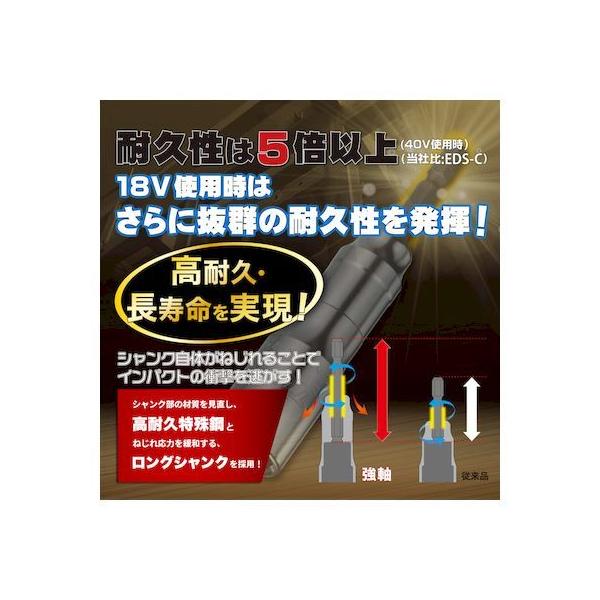 トップ工業メーカーお問い合わせ:0256-33-1681【商品説明】●特徴●40vインパクト対応(7.2v~18vいずれも対応) 耐久性5倍以上(40v使用時・当社比:EDS-C)●ロングシャンク採用でより高トルクインパクトの使用でもねじれ応力を緩和し、軸折れを防ぐことで高耐久、長寿命を実現●六角シャンクの材質を高耐久特殊鋼に変更。高トルクに耐える強い軸に●仕様、規格●寸法 L83mm 差込角12.7mm 重量72g