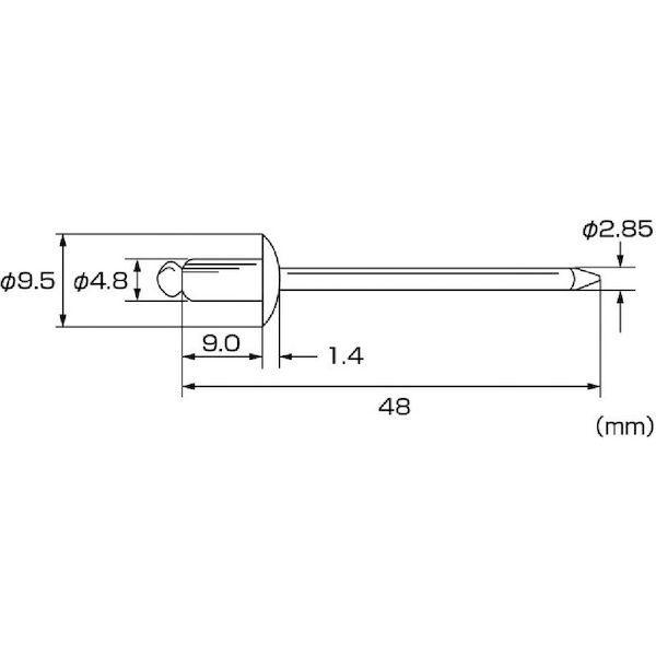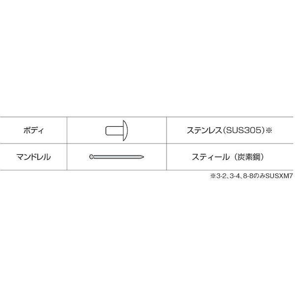 ロブテックスメーカーお問い合わせ:072-980-1111【特長】●必要な仕事に無駄なく使える少量サイズです。●片側から複数の母材をワン・アクションで締結できます。【仕様】●かしめ板厚(mm):1.6~4.8●リベット長(mm):9.0●フランジ径(mm):9.5●リベット径(mm):4.8●下穴径(mm):4.9~5.0●せん断荷重(N):5450●引張荷重(N):6350【仕様2】●エコパック入り【材質/仕上】●ボディ:ステンレス(SUS305)【注意】●適正かしめ板厚、下穴径は当社指定寸法を守り安全率を十分に考慮して施工してください。【原産国】日本