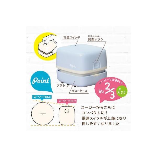 【商品説明】●ミニクリーナーでデスクをいつも清潔に!●ちいさくてもパワフルキャッチ●上向き排気でゴミを舞い上げない●その場でキレイに!サッとカンタンお掃除!●登録実用新案 上向き排気で小さなゴミを巻き上げずパワフルキャッチ!●大好評のスージーがさらにコンパクトに。デスクに置いたままでもかわいいサイズ感●オーバーヒート防止機能付。モーターによる発熱を感知して電源を遮断●開閉ボタン付きでゴミ捨てカンタン●上部の電源スイッチで、カンタンON/OFF●単4乾電池2本使用(別売)●本体=ABS●本体:60×57×70mm●パッケージ:135×105×70mm