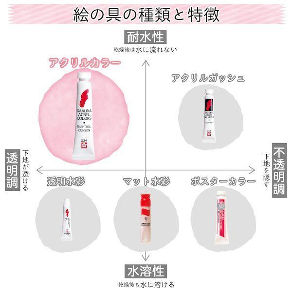 サクラクレパスメーカーお問い合わせ:06-6910-8823【商品説明】●水で溶いて使用でき、乾くと耐水性になります。●接着性が強く、金属・紙・木・布・プラスチックなど幅広い素材に描けます。●メディウムとの併用ができるため表現の幅が広がります。●透明調で艶があり、油絵の具のような力強い表現が、水彩絵の具を使う手軽さで楽しめます。●使いやすく、お得な12mlラミネートチューブ入りです。
