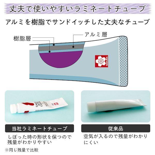 サクラクレパスメーカーお問い合わせ:06-6910-8823【商品説明】●水で溶いて使用でき、乾くと耐水性になります。●接着性が強く、金属・紙・木・布・プラスチックなど幅広い素材に描けます。●メディウムとの併用ができるため表現の幅が広がります。●透明調で艶があり、油絵の具のような力強い表現が、水彩絵の具を使う手軽さで楽しめます。●使いやすく、お得な12mlラミネートチューブ入りです。