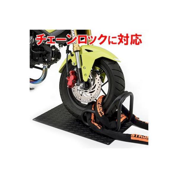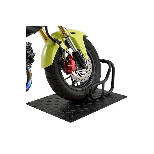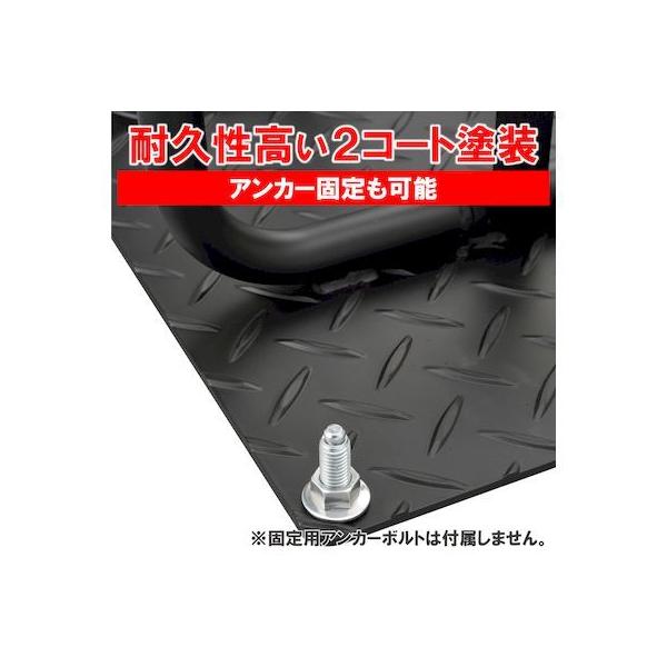 デイトナメーカーお問い合わせ:0120-60-4955【商品説明】硬い!重い!ゴツイ!バイクの自重も使って強力固定。車両を本品の上に乗せてからU字ロックやチェーンロックをパイプ部分に通して固定します。固定後は車両重量も加わりロック単品で固定した状態よりも盗難抑止効果が高くなります。耐久性が高く屋外でも錆びにくい2コート塗装仕上げ。●プレートサイズ:590×430mm●表面処理:カチオン黒+静電黒の2コート仕上げ●アンカー固定可能。プレート四隅に固定用のφ10.5の穴有り●縞鋼板:t3.2 / パイプ:φ22. 2(t1.6)●本体重量:8.2kg