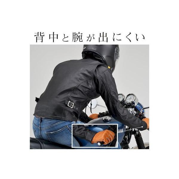オーソドックスな外観とは裏腹に、前傾姿勢をとったとき最適になるパターンや、プロテクター用の内ポケット、表面はっ水加工など、ライディングに便利な機能が充実しています。