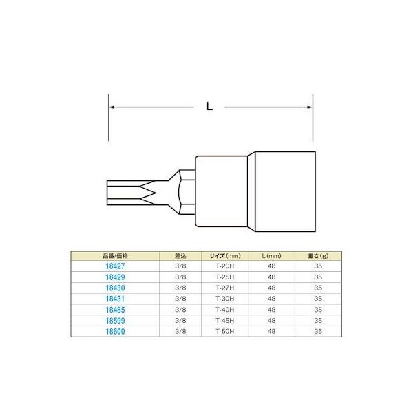 デイトナメーカーお問い合わせ:0120-60-4955【商品説明】ヘクサロビュラ(ピン付きトルクス)いじり止め対応のソケット単品。差込角3/8インチ(9.5mm)に対応。●サイズ:T-25H●差込角:3/8インチ(9.5mm)●長さ:48mm