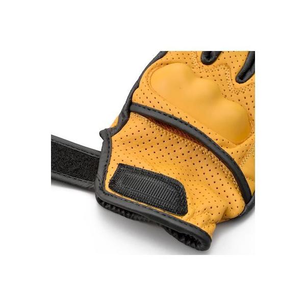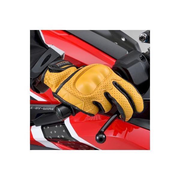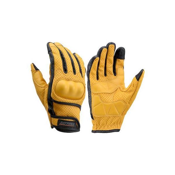 デイトナメーカーお問い合わせ:0120-60-4955【商品説明】しっとり柔らかな牛革をフィット感の良い立体裁断で仕立てたライディンググローブ。パンチング部は裏地もメッシュ生地にすることで、通気性を確保しました。ハードナックルプロテクターは手を握ったときにも突っ張りが少ないフローティング構造を採用しています。人差し指のタッチパネル対応部は側面まで回り込んでいるので、ストレスなくスマートフォンを操作できます。●サイズ:Sサイズ●カラー:イエロー●素材:牛革 / メッシュ生地 / プロテクター:PVC●パンチング / 春夏秋●タッチパネル対応