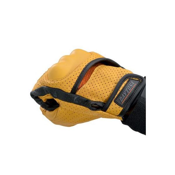 デイトナメーカーお問い合わせ:0120-60-4955【商品説明】しっとり柔らかな牛革をフィット感の良い立体裁断で仕立てたライディンググローブ。パンチング部は裏地もメッシュ生地にすることで、通気性を確保しました。ハードナックルプロテクターは手を握ったときにも突っ張りが少ないフローティング構造を採用しています。人差し指のタッチパネル対応部は側面まで回り込んでいるので、ストレスなくスマートフォンを操作できます。●サイズ:Mサイズ●カラー:イエロー●素材:牛革 / メッシュ生地 / プロテクター:PVC●パンチング / 春夏秋●タッチパネル対応