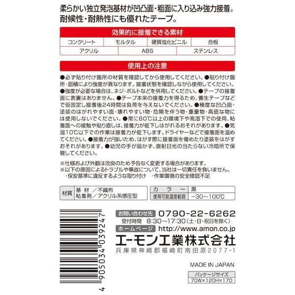 【商品説明】●すぐ付く●凹凸追従性が良い●パッキンとして止水に使える(密着性が高い) 【仕様】・サイズ:幅10mm×長さ1m 厚さ1.0mm・使用温度範囲:-30~100℃・カラー:黒・材質:基材/不織布 粘着剤/アクリル系【効果的に接着できる素材】コンクリート・モルタル・硬質塩化ビニル・合板・アクリル・ABS・ステンレス【内容物】・強力両面テープ:1巻