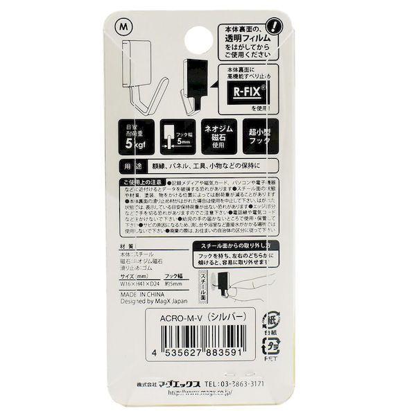 マグエックスメーカーお問い合わせ:03-3863-3171【商品説明】●超コンパクトで狭い場所にも付けられて高耐荷重!特許取得済の新すべり止め材を使用している為、スチール面にピタッとくっつき滑りにくく壁面を傷つけません。【商品用途】●額縁、パネル、工具、小物などの保持に【注意】●記録メディアや磁気カード、パソコンや電子機器などに近付けるとデータを破損する恐れがあります。● スチール面の状態や材質、塗装、物をかける位置によっては耐荷重が減ることがあります。● 本体裏面の滑り止め材が剥がれた場合は使用を中止して下さい。● エッジ部分などで手を切る恐れがありますのでご注意下さい。● 電話線や電気コードなどをかけないで下さい。● 幼児の手の届かないところで使用・保管して下さい。● サビの原因になるため、流し台や浴室など直接水がかかる場所では使用しないで下さい。● 廃棄の際は、お住まいの自治体の区分に従って下さい。【仕様】●規格:Mサイズ● 目安保持荷重:5kgf【カラー】●シルバー【商品サイズ】●W:16mm●H:41mm●D:24mm【材質】●本体:スチール● 磁石:ネオジウム磁石● すべり止め:ゴムミニフック 磁石付きフック