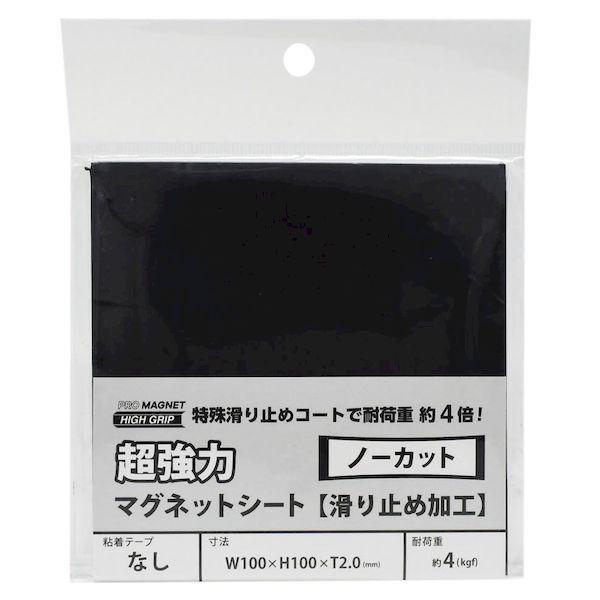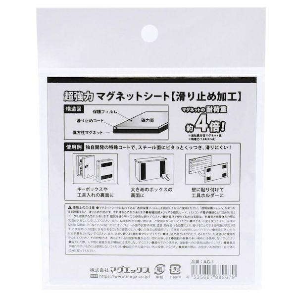 マグエックスメーカーお問い合わせ:03-3863-3171【商品説明】●独自開発の特殊滑り止めコートでスチール面にピタッとくっつき滑りにくい。● マグネットの耐荷重は従来品の約4倍(当社比)。【商品用途】●キーボックスや大型ボード、郵便受等の大きめのボックスの裏面に貼り付けてスチール製の壁面に取り付ける事が出来ます。● 磁力面を手前になる様に設置すればスチール製工具のホルダーとして使えます。【注意】●透明保護フィルムを貼ったまま設置しますと滑り止めが効かず、ずれ落ちる恐れがあります。透明保護フィルムを剥がしてからご使用下さい。● 各種記録メディアや磁気カード、パソコン、電子機器などに近付けるとデータを破損する恐れがあります。磁気を嫌う所へのご使用は避けて下さい。● 粘着材を使って張付ける際は、粘着面と被着体との間に気泡が入らないようして下さい。粘着面が付き難い物には使用しないで下さい。● マグネット面を使ってスチール面に貼り付ける際は、平らなところに貼って下さい。スチール面の状態、材質、塗装、物を掛ける位置により、掛けることのできる荷重が異なりますので、ご使用時には荷重に余裕があることをご確認下さい。● この商品は壁面用です。天井面では使用しないで下さい。● 垂直以外の方向には荷重をかけないで下さい。また、あまり勢いよく物を乗せないで下さい。● 滑り止め材が剥がれたり、めくれたりした場合は使用を中止して下さい。● 振動や衝撃の多い場所には使用しないで下さい。● 落下した際、人や物に被害が及ぶ場所には使用しないで下さい。● 屋外での使用や、自動車への使用は避けて下さい。● 貴重品や壊れやすいものには使用しないで下さい。● 幼児の手の届かない所に保管して下さい。● 廃棄の際は、お住まいの市町村・自治体の区分の従って下さい。【仕様】●耐荷重:約4kgf【カラー】●黒【商品サイズ】●厚み:2mm●幅:100mm●長さ:100mm【材質】●異方性マグネット強保持