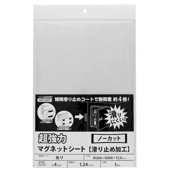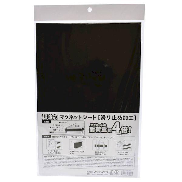 マグエックスメーカーお問い合わせ:03-3863-3171【商品説明】●独自開発の特殊滑り止めコートでスチール面にピタッとくっつき滑りにくい。● マグネットの耐荷重は従来品の約4倍(当社比)。【商品用途】●キーボックスや大型ボード、郵便受等の大きめのボックスの裏面に貼り付けてスチール製の壁面に取り付ける事が出来ます。● 磁力面を手前になる様に設置すればスチール製工具のホルダーとして使えます。【注意】●透明保護フィルムを貼ったまま設置しますと滑り止めが効かず、ずれ落ちる恐れがあります。透明保護フィルムを剥がしてからご使用下さい。● 各種記録メディアや磁気カード、パソコン、電子機器などに近付けるとデータを破損する恐れがあります。磁気を嫌う所へのご使用は避けて下さい。● 粘着材を使って張付ける際は、粘着面と被着体との間に気泡が入らないようして下さい。粘着面が付き難い物には使用しないで下さい。● マグネット面を使ってスチール面に貼り付ける際は、平らなところに貼って下さい。スチール面の状態、材質、塗装、物を掛ける位置により、掛けることのできる荷重が異なりますので、ご使用時には荷重に余裕があることをご確認下さい。● 表記耐荷重はマグネットの耐荷重で粘着テープの耐荷重ではありません。高荷重の物へ使用する際は接着剤を併用するか、無地タイプのシートに接着剤を塗布してご使用下さい。● この商品は壁面用です。天井面では使用しないで下さい。● 垂直以外の方向には荷重をかけないで下さい。また、あまり勢いよく物を乗せないで下さい。● 滑り止め材が剥がれたり、めくれたりした場合は使用を中止して下さい。● 振動や衝撃の多い場所には使用しないで下さい。● 落下した際、人や物に被害が及ぶ場所には使用しないで下さい。● 屋外での使用や、自動車への使用は避けて下さい。● 貴重品や壊れやすいものには使用しないで下さい。● 幼児の手の届かない所に保管して下さい。● 廃棄の際は、お住まいの市町村・自治体の区分の従って下さい。【仕様】●耐荷重:約4kgf(100mm×100mm使用の場合)● 粘着テープ付【カラー】●黒【商品サイズ】●厚み:2mm●幅:200mm●長さ:300mm【材質】●異方性マグネット、粘着剤のり付きマグネット マグネットシール