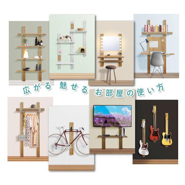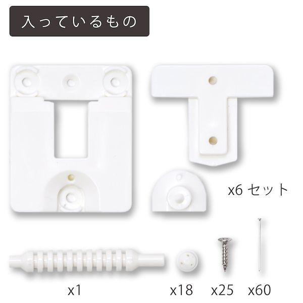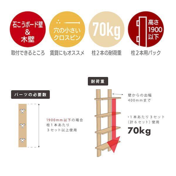 アイワ金属メーカーお問い合わせ:06-6725-5571【商品説明】●1×4材で柱を立てる壁面DIYパーツ● 石膏ボード壁&木壁に取付け出来ます。● 穴の小さいクロスピン使用で賃貸にもオススメ。【商品用途】●壁と木材(1×4材)、各々にパーツを取り付け、木材を壁面に引っ掛けて柱にします。【注意】●表示の耐荷重は柱全体にかかる合計荷重です。取付けるパーツや乗せる物それぞれの重量また、棚を取付ける場合はその出幅等にもご注意下さい。詳しくは添付の画像をご覧下さい。【仕様】●柱2本の耐荷重:70kg●1900mm以下の柱を2本立てられる6セット入りパック【カラー】●白【商品サイズ】●A:60mm●B:50mm●C:10mm●D:36mm●E:47mm●F:41mm●G:50mm●H:7.5mm●I:20mm●J:24.5mm【材質】●クロスピン:鉄● 皿タッピングネジ:ステンレス● その他各パーツ:ABS【付属品】●皿タッピングネジ(φ3.5×16mm)壁面収納 棚柱 ラック シェルフ パーツ