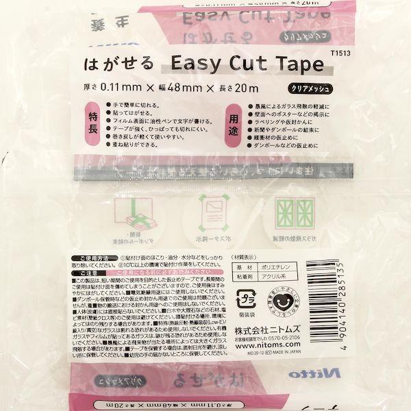 ニトムズメーカーお問い合わせ:03-3544-0615【商品説明】●住まいに1つ、いろいろ使える便利なテープ●手で簡単に切れる。●貼ってはがせる●フィルム表面に油性ペンで文字が書ける。●テープが強く、引張っても切れにくい。●巻き戻しが軽くて使いやすい。●重ね貼りができる。【商品用途】●暴風によるガラス飛散の軽減に●壁面へのポスターなどの掲示に●ラベリングや仮封かんに●新聞やダンボールの結束に●緩衝材の仮止めに●ダンボールなどの仮止めに【注意】●貼付け面のほこり・油分・水分などをしっかり取り除いてください。●10℃以上の環境で貼付け作業をしてください。●この製品は、短い期間のご使用を目的とした仮止めテープです。長期間のご使用は貼付け面を傷めてしまうことがございますので、ご使用後はすみやかにはがしてください。●電気絶縁用途にはご使用しないでください。●ダンボール保管時などの仮止め封かん用途でのご使用は問題ございませんが、重量物の搬送における封かん用途へのご使用はしないでください。●人体(皮膚)には直接貼らないでください。●白木や大理石などの石材、塩ビ素材(壁紙クロス等)のご使用は避けてください。●貼り付ける場所、環境によってはのり残りする場合があります。●特殊(熱線反射・熱線吸収(Low-E)/線入り/真空)なガラスは割れる恐れがあるため使用しないでください。●有機ガラスやフィルムが貼ってあるガラスは、跡が残る恐れがあるため使用しないでください。●暴風による飛来物が当たる場所によっては大きくガラス飛散する場合があります。●テープを保管する場合は直射日光を避け、涼しい所に保管してください。●幼児の手の届かないところに保管してください。【カラー】●クリアメッシュ【商品サイズ】●厚さ:0.11mm●幅:48mm●長さ:20m【材質】●基材・ポリエチレン、粘着剤・アクリル系クロステープ 再剥離 暴風対策