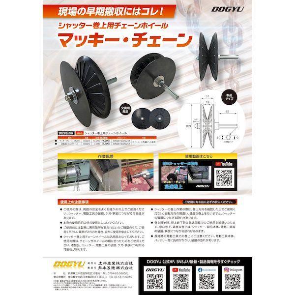 土牛産業メーカーお問い合わせ:0794-82-0880【商品説明】●特徴●シャッターの点検後の巻上作業用に。●チェーンをホイールで回し早期撤収に貢献します。●シャッタ巻上用チェーンホイールは汎用品のため様々なサイズに対応します。●仕様、規格●寸法●全長(約):109×102mm●全重量(約):280g●注意事項●シャッタ巻上用チェーンホイールは汎用品のため、使用の際は、チェーンがホイールの巾にあったものをご使用ください。●巻上作業の際は、巻上方向を確認したうえでご利用ください。回転方向の間違い、過度な巻上を行うとシャッターの破損につながる恐れがあります。●巻上開始時、終了時は低速回転でのご使用を推奨いたします。過度な巻上や急な巻上は、シャッター、製品本体、電動工具などの破損、事故につながる恐れがあります。●長時間の電動工具での巻上作業は、電動工具本体、バッテリー等に負荷がかかりますのでご注意ください。