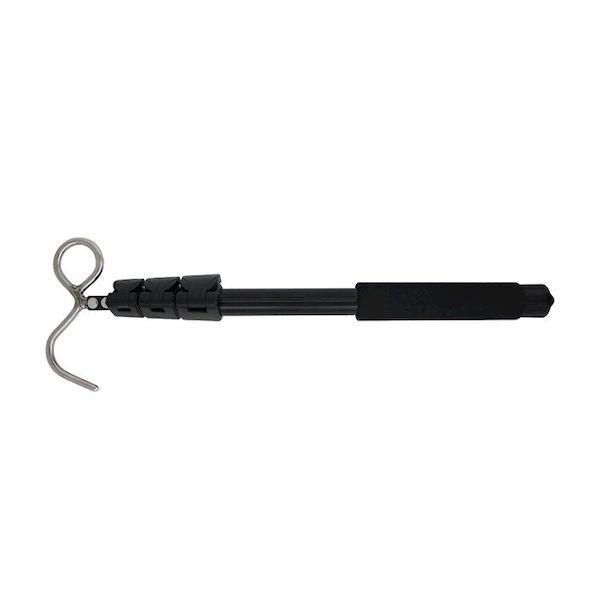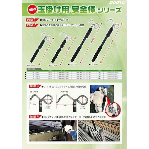 土牛産業メーカーお問い合わせ:0794-82-0880【商品説明】●特長●伸縮シャフトにより携行可能です。●従来の玉掛用の手鉤より、コンパクトかつ軽量になりました。●リング形状により、カラビナ工具差しで携帯できます。●ロック式シャフトのため、吊荷やワイヤーロープの押し止め引きが可能です。●仕様、規格●シャフト部:4段伸縮ロックシャフト●シャフト寸法(約):360~1250mm●リングサイズ(約):H26×W29mm●フック部分幅(約):54mm●全重量(約):200g