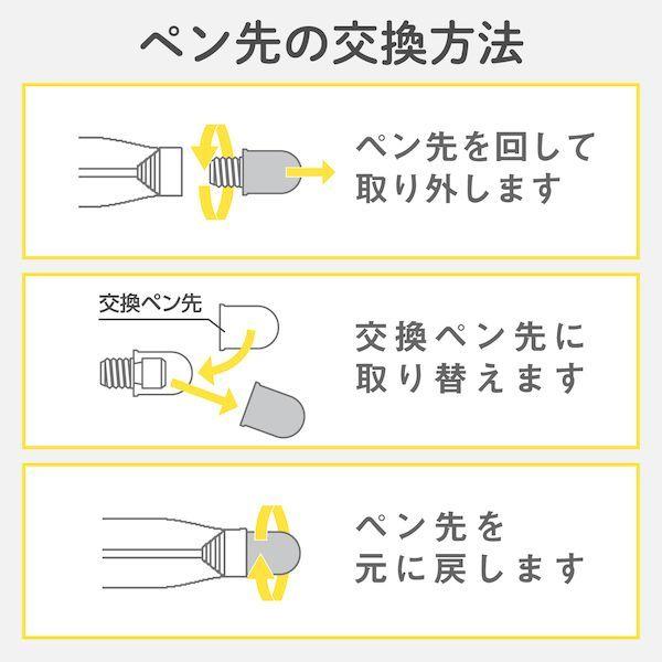 エレコムメーカーお問い合わせ:0120-898-794【商品説明】●高密度ファイバーチップを採用し、超感度を実現したP-TPBPENBK、P-TPEN02Sシリーズ、P-TPSLIMCシリーズ交換用のペン先です。●ペン先直径が5.5mmで、細かい操作も快適にできます。●交換用のペン先2個入りです。●タッチペン本体のペン先を回して、古いペン先の取り外し、交換ができます。●高密度ファイバーチップにより、軽い力で滑らかな操作が可能です。●ペン先に植毛された繊維が広範囲の接地面積を確保することで、ペン先を押し当てることなく、滑らかに操作できる超感度を実現しました。●指先でのタッチ操作と違い、液晶画面を汚さずに操作可能です。●タップ操作、スライド操作どちらも快適に行えます。