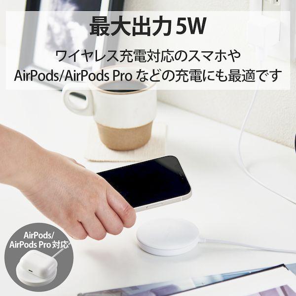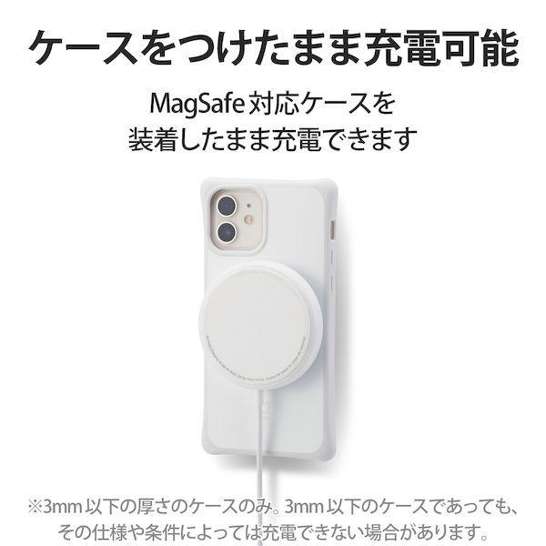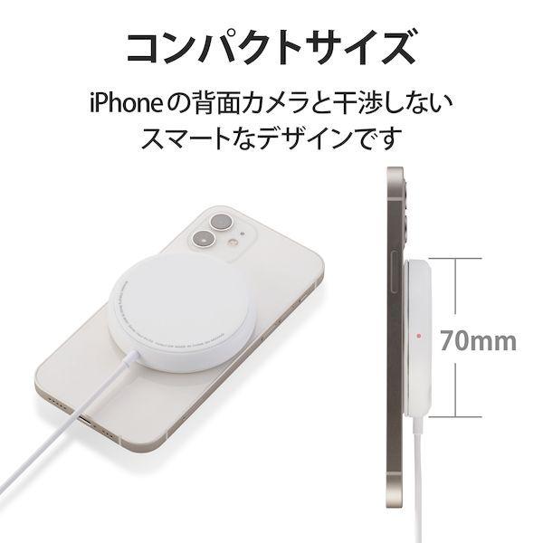 エレコムメーカーお問い合わせ:0120-898-794【商品説明】●MagSafe対応iPhoneシリーズにマグネットで固定でき、5Wで充電ができるワイヤレス充電器です。●※本製品の充電出力は5Wです。MagSafe規格15Wの充電には対応しません。●マグネットによりコイル位置が合うので、効率よく充電可能です。●Lightning端子を使用しないので、イヤホンを使いながら充電でき、またコネクタの水濡れによるショートの事故を抑制します。※本製品は防水構造ではありません。●マグネットでiPhoneの背面に取り付けるので、充電しながらスマホの操作が容易にできます。●iPhoneの背面カメラと干渉しない、コンパクトサイズです。●異物検知機能、温度上昇保護機能などを搭載しており、安全にご利用いただけます。●天面に滑り止めパッドを配置し、スマートフォン本体へのキズやバイブレーションによる滑り落ちを抑制します。●充電状況が確認できる動作確認LEDが付いています。●スマートフォンを縦に置いても横に置いても動作確認LEDを確認できるように、2つのLEDを搭載しています。●MagSafe対応ケースをつけたまま充電することも可能です。※3mm以下の厚さのケースのみ。3mm以下のケースであっても、その仕様や条件によっては充電できない場合があります。●本体カラーと同色で、ゆったりと接続できる長さ約100cmの一体型ケーブルを採用しています。●本製品は磁石を使用しています。磁気カード(クレジットカード・キャッシュカードなど)を近づけないでください。●※本製品にはUSB出力アダプタ(AC充電器等)は付属しておりません。本製品をご利用いただくには出力5V/2A以上のUSB出力アダプタを別途ご用意ください。●※充電対応機種は対応表をご確認ください。