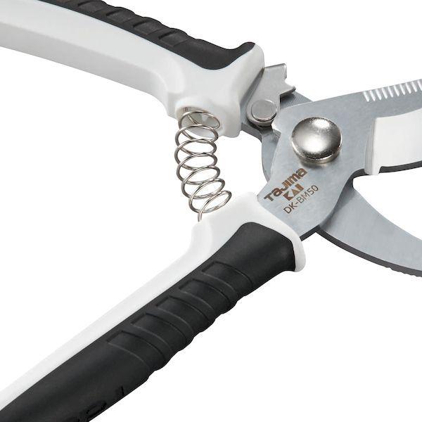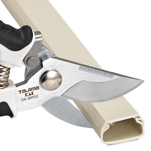 (株)TJMデザインメーカーお問い合わせ:0120-125577【商品説明】●特徴●片手で使えるスプリング機構付●樹脂管、モールをラクに1回で切る大型刃●グリップ力が活きるエラストマーグリップ●ロックは片手で簡単に解除できるワンタッチロック機構●安全ロープ取り付け用穴●片手で楽に切断ができる スプリング機構●バリ取り溝●仕様、規格●サイズ 全長 190mm 刃長50mm●製品重量(g):139●切断対象:モール(32mm幅迄の樹脂製品)、樹脂(CD/PF管等)直径30mm程度、VCT線:5.5mm?×3芯●材質●SK-5●PP+GF10●TPR(エラストマー)